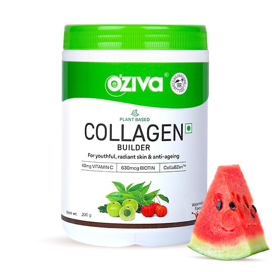 OZiva Vegan Collagen (Watermelon) with Biotin & Vitamin C For Brighter & Youthful Skin | Collagen Supplement For Women & Men | Plant Based Powder | Certified Vegan 200g (Pack of 1)