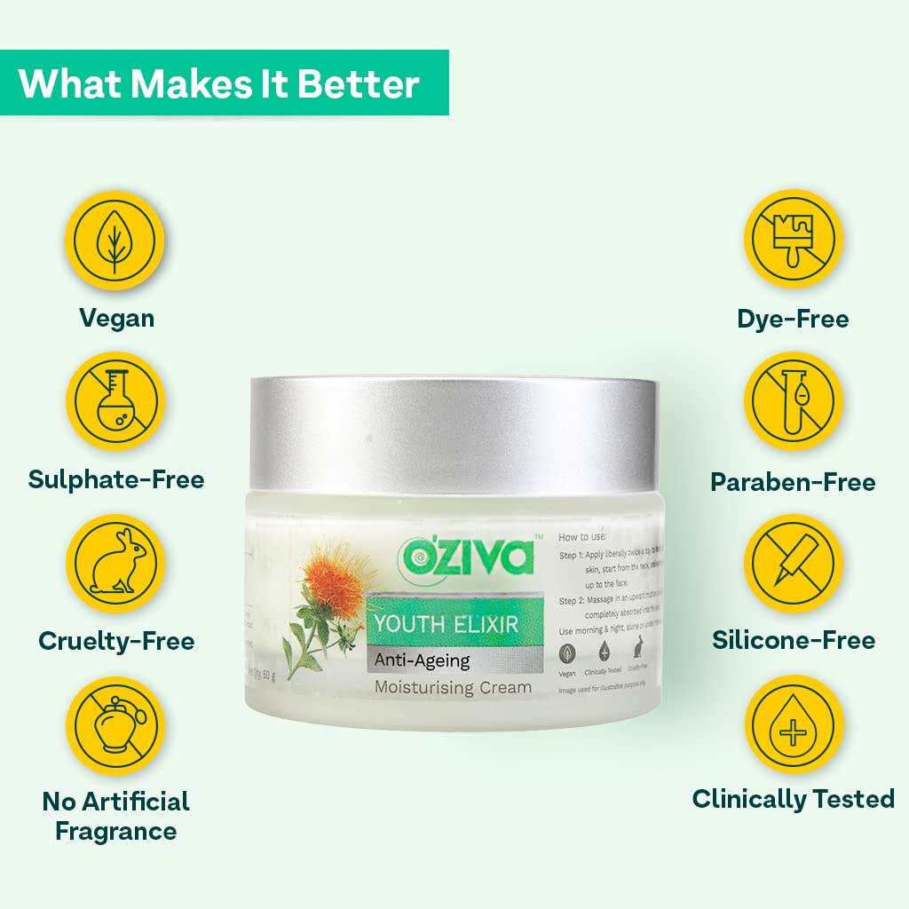 OZiva Youth Elixir Moisturising Cream | Contains Phyto Retinol Rose & Tiare Flower for supporting reduction in wrinkles and helping skin tightening | 50 g
