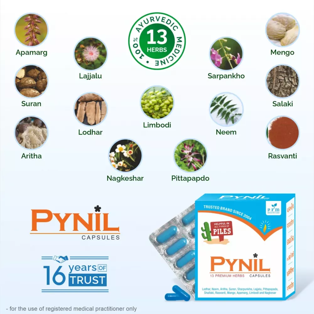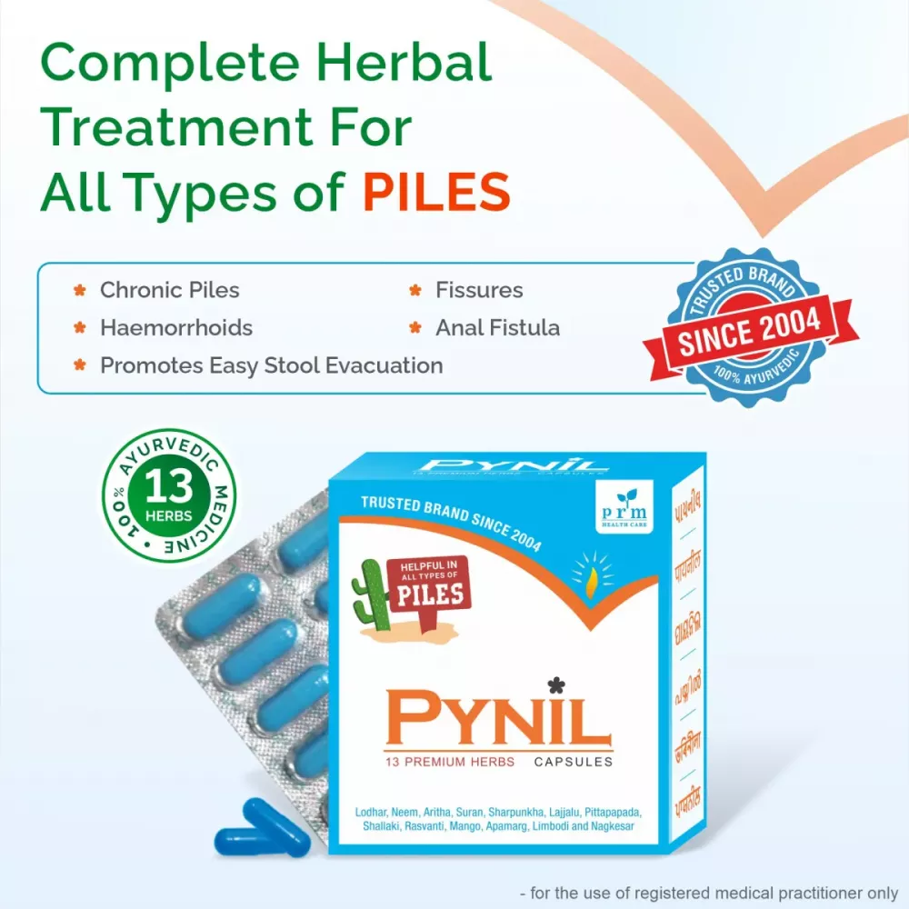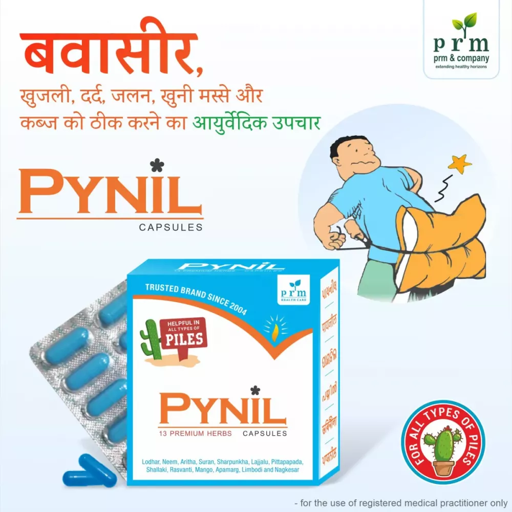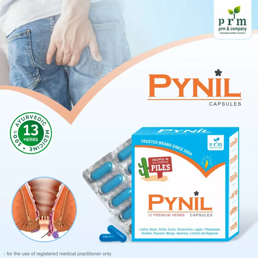 Piles is a very painful and annoying phenomenon, here at PRM we feel proud for providing consistent and ensured piles care Pynil Capsules which came in existence through mixing of total 13 selected herbs created namely Suran, Aritha bhasma, Lajjalu, sharpankho, Pittapapdo and many more. Pynil capsules is a natural Ayurvedic Proprietary formulation to fulfill all the objectives for the management of piles