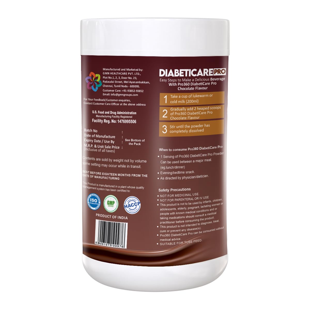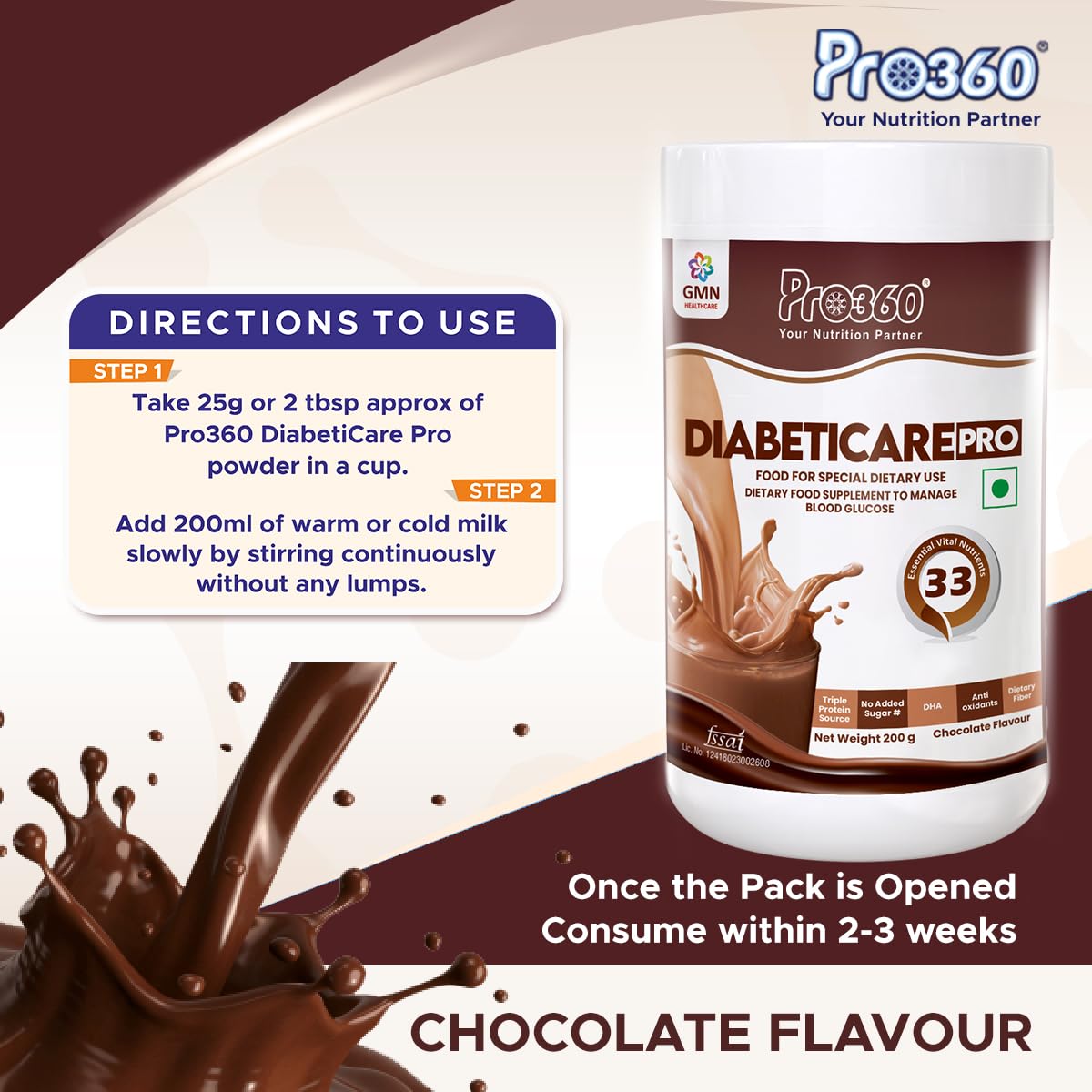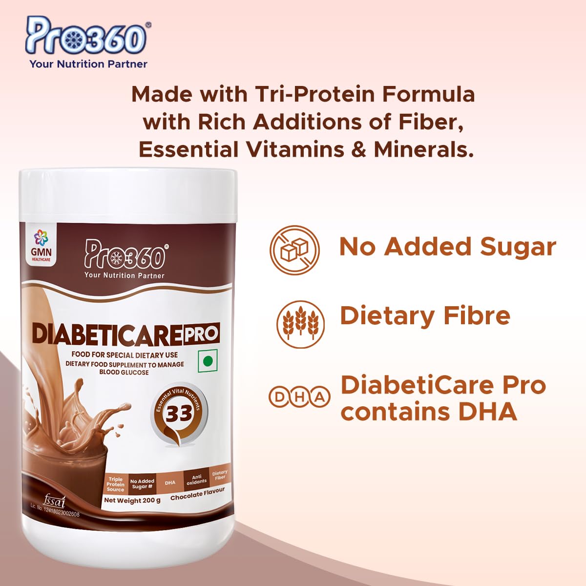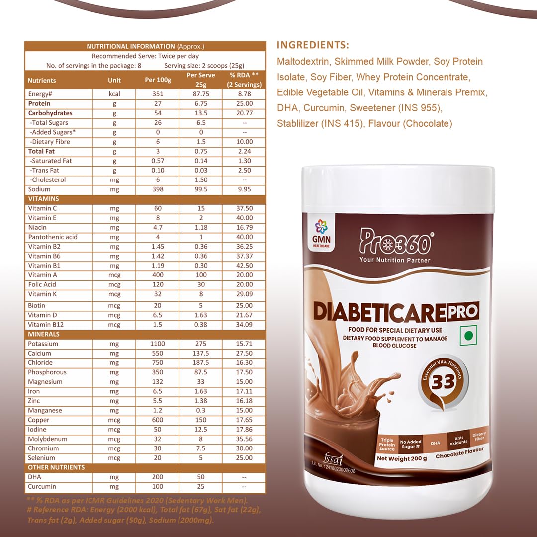 DIABETIC CARE PROTEIN : Pro360's unique formula provides an amazing dose of Protein as well. The Tri-Protein Formula consists of Skimmed Milk powder Whey Protein Concentrate and Soy Protein Isolate – The combination that makes an ideal Protein Rich meal.