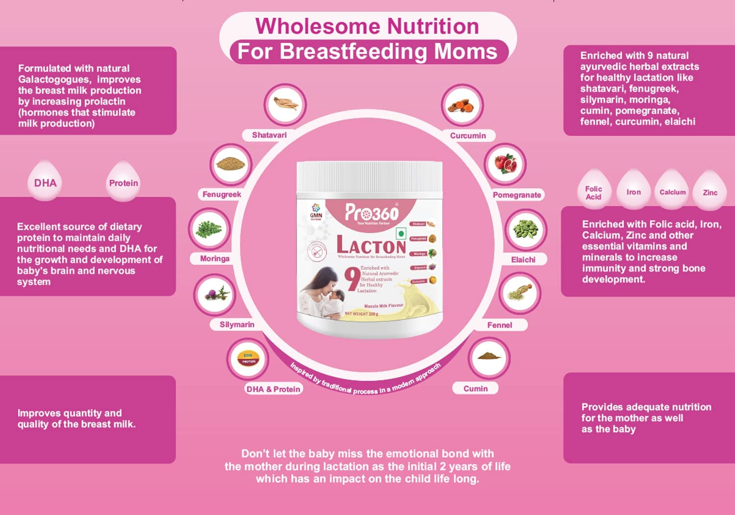 HomeHealth & PersonalDiet & NutritionHealth SupplementsPro360 Lacton for Breastfeeding and Lactating Mothers Milk Supplement Powder - Lactation Support Booster with Herbal Extracts - Helps to Increase Breast Milk - Masala Milk Flavor 400g (Pack of 1)