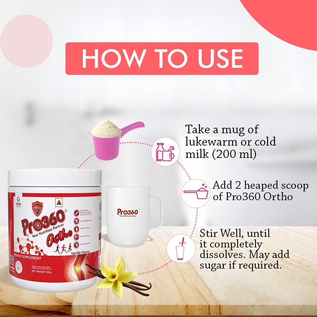Pro360 Ortho Bone and Joint Care Supplement Nutrition Powder with Glucosomine Chondroitin MSM Collagen Peptides Boswellia Serrata Hyaluronic Acid - Diabetic Friendly - Vanilla Flavour 250g (Nonveg)