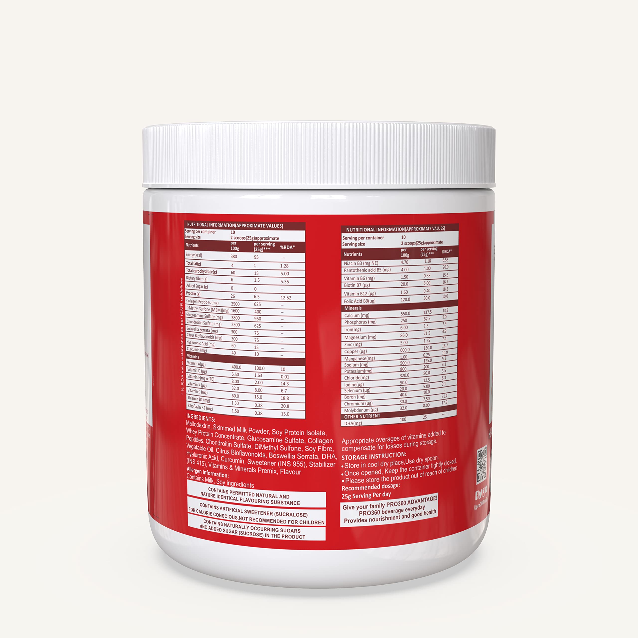 Active Ingredients: Our protein drink enriched with Vitamin D and contains glucosamine with chondroitin sulfate collagen peptides msm citrus bioflavonoids boron and calcium which helps in managing bone and joint related problems