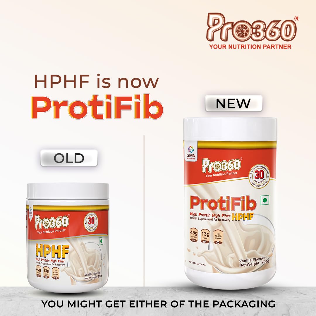 Pro360 Protifib HPHF High Protein High Fiber is scientifically formulated specialized adult nutrition supplement powder to meet the increased needs for faster recovery from critical illness. No added sugar formula which supports diabetes persons also 45g of High Protein - Supports immune function and wound healing and helps to restore body protein 13g of High Fiber - Contains Prebiotic FOS fiber which supports bowel movements and digestion Immuno Nutrients - Enriched with Iron Folic Acid Zinc Vitamin A B6 and B12 which improves the immunity function of the body Antioxidants - Contains Vitamin C Vitamin E and Selenium which gives protection from free radicals. Suitable for Enteral Feeding (Tube Feed) only under strict physician's or dietician's supervision or guidance. Directions to use: Take a cup of 200ml preboiled cooled water or milk and add 2 scoops (25g) of powder and mix well without any lumps and consume immediately