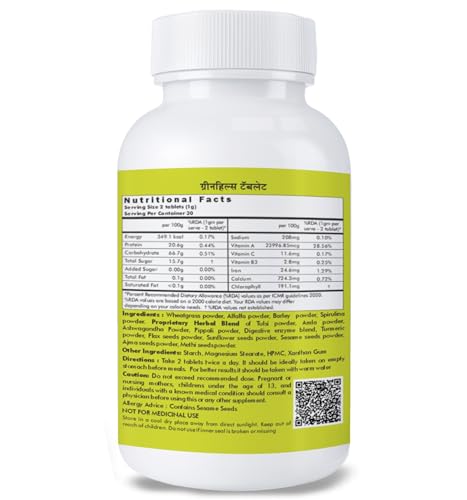Ingredients: Barleygrass Wheatgrass Alfalfa Spirulina Proprietary herbal blend Flax seeds Sesame seeds Sunflower seeds Tulsi Ashwagandha Turmeric Amla Pippali Methi seeds Ajwain & Super digestive Enzymes blend