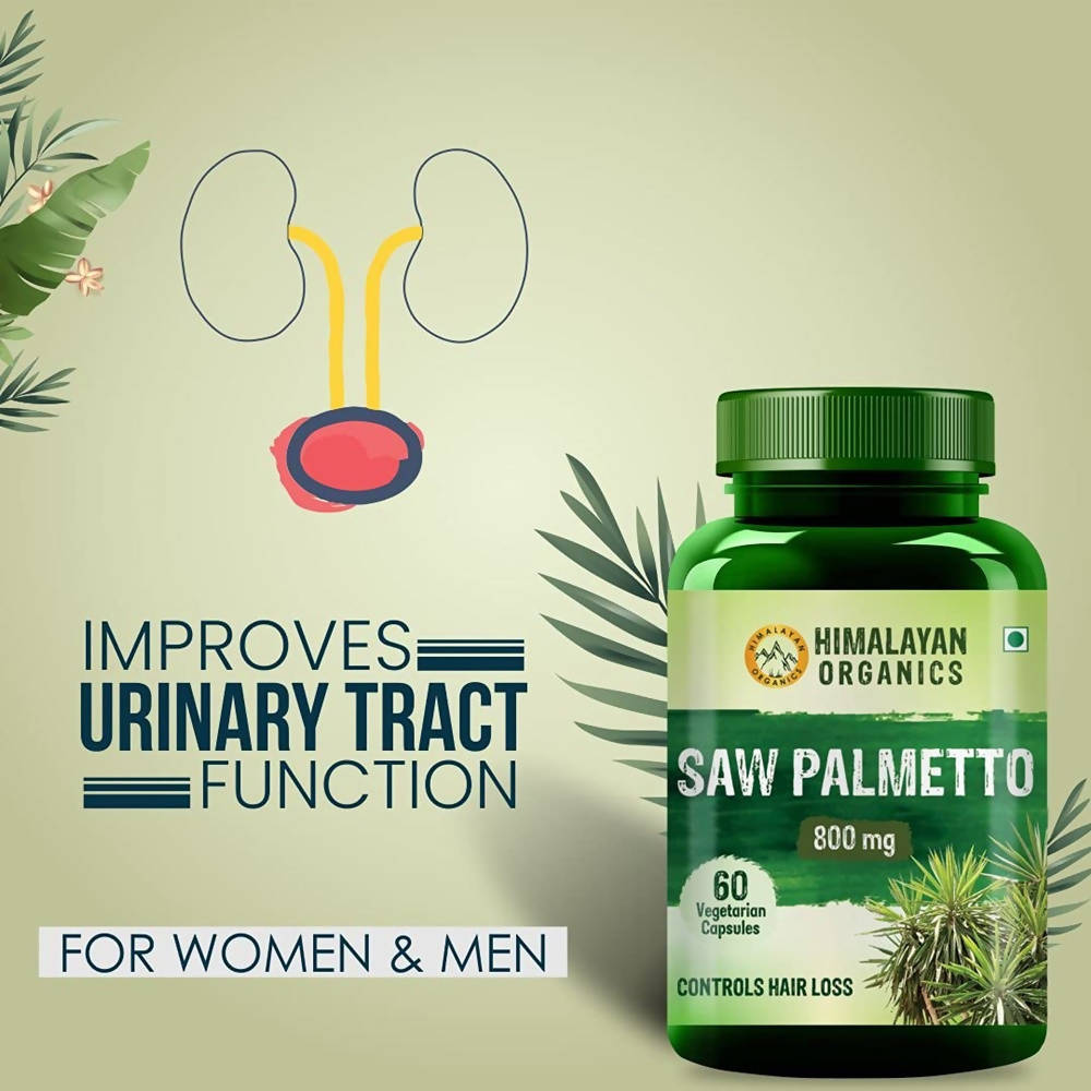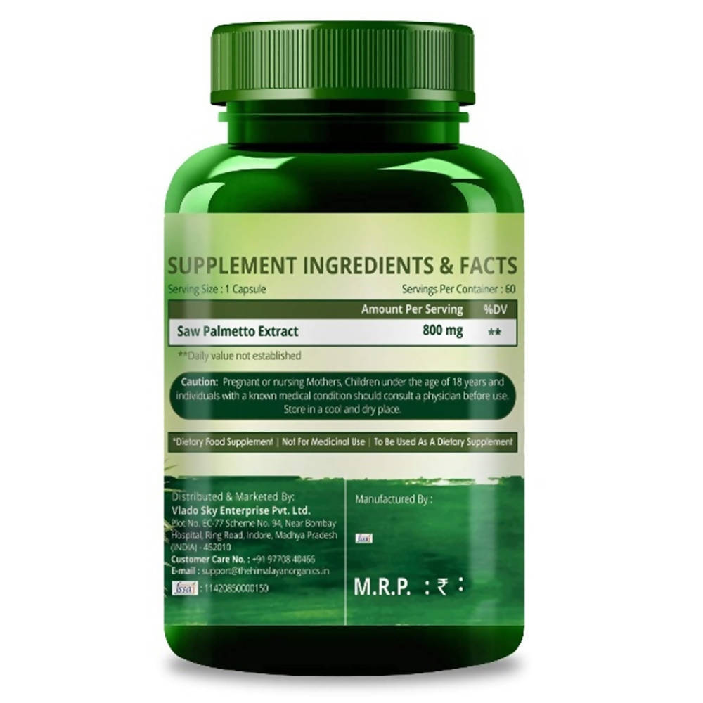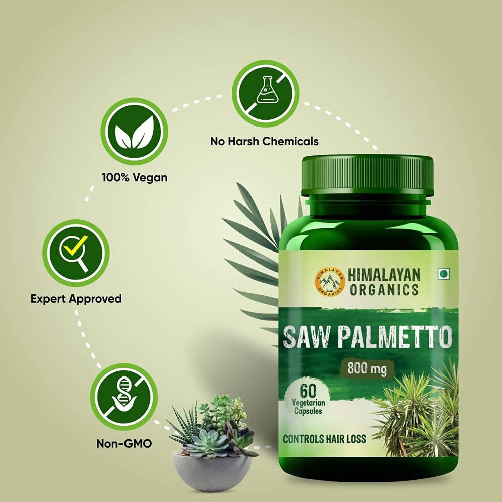 Himalayan Organics Saw Palmetto Controls Hair Loss: 60 Vegetarian CapsulesNourished Hair Health: Himalayan Organics Saw Palmetto may help to maintain healthy levels of DHT in the body, which makes hair follicles strong and nourishes hair. In fact, it even works well with damaged and over-processed hair, promoting natural and nourished hair growth.Blemish-Free Skin: The product is beneficial in dealing with increased acne as Saw Palmetto manages the production of Sebum, an oily secretion that makes skin prone to acne. The product also deals with breakouts, manages acne growth, and promotes glowing, nourished, and gorgeous skin.Relief From Stress: Undoubtedly, Saw Palmetto is known to balance the levels of hormones in our body. The adequate quantity of Saw Palmetto may help manage the level of stress in this competitive and chaotic world.Natural & Gluten Free: Himalayan Organics Saw Palmetto is a natural dietary supplement free from gluten, eggs, fish, milk. Focused on sustainable farming and products, we do not encourage the usage of Artificial Colors, Binders, Synthetic Chemicals, or Preservatives.Special Ingredients: Gluten, NaturalDosage Form: CapsuleBrand: Himalayan OrganicsNet Quantity: 60 countLegal Disclaimer: The product is guaranteed to be 100% genuine. Product images are for illustrative purposes