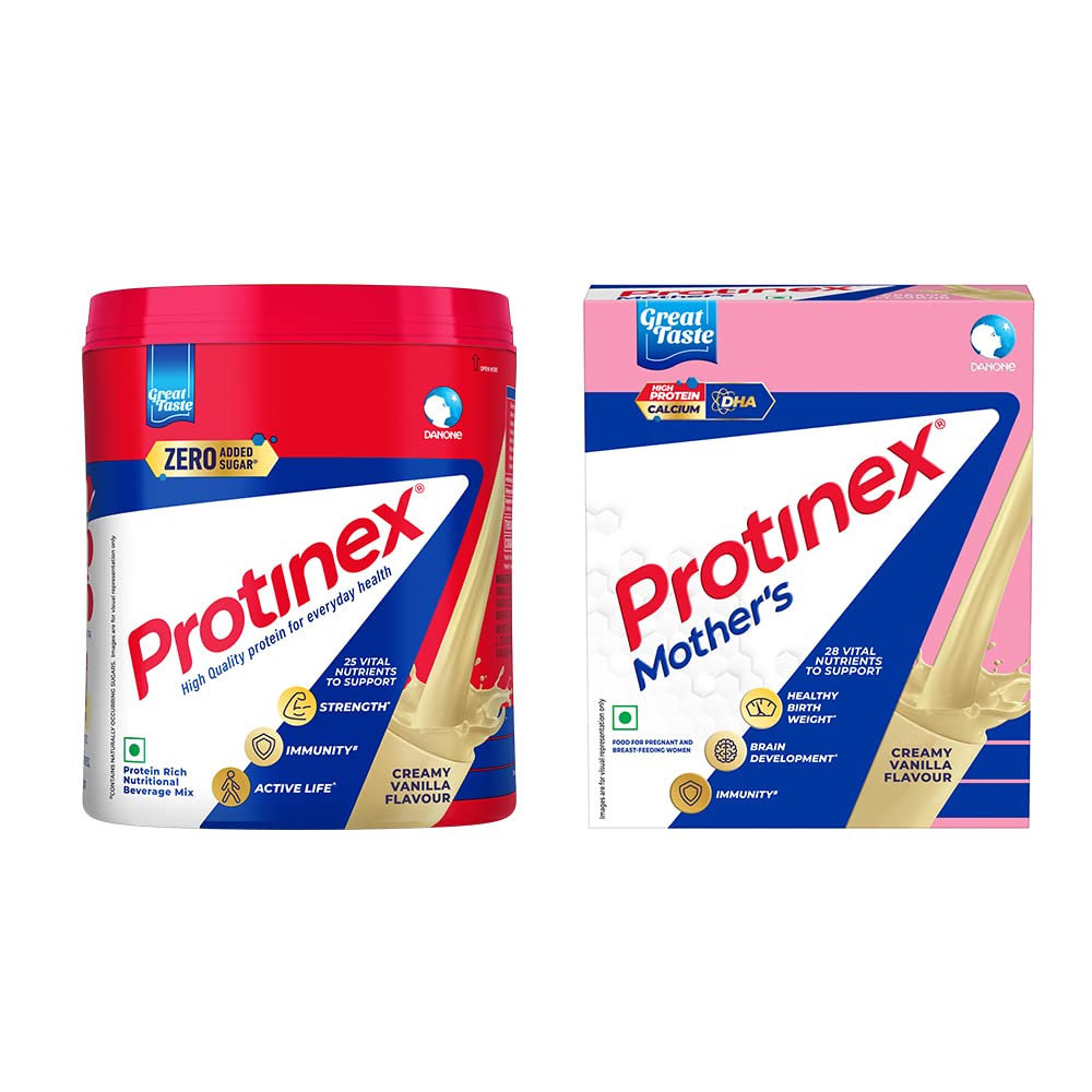 Protinex Health And Nutritional Drink Mix For Adults with High protein & 10 Immuno Nutrients Vanilla Delight 400gProtinex Vanilla Delight is a vegetarian ready to serve beverage mix that helps bridge the gap of nutrients from diet of Indian Adults. Protinex Vanilla Delight is an adult nutritional drink mix that is clinically proven to provide 34% higher immuno boosters that help build immunity# 12 Protinex contains 22 essential vitamins and minerals including 10 immuno nutrients³; that help support immunity build strength and provide energy. Protinex consists of nutrients that help in building bone strength growth & maintenance of muscle mass improving metabolism formation of blood cells and maintaining fluid & electrolyte balance**. Available in vanilla flavor Protinex easily makes its place in your everyday diet plan and with zero added sugar* and low fat it is suitable for daily consumption. It can be taken with milk or water.Protinex Mama - 250 g (Vanilla)Protein supplement for Healthy Mother Healthy Baby.