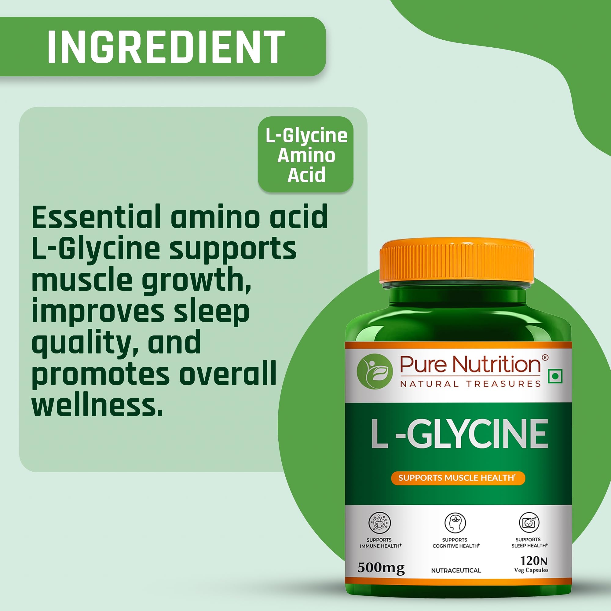 Pure Nutrition L-Glycine 500mg is a premium amino acid supplement designed to support muscle recovery brain function and restful sleep. Each vegetarian capsule delivers 500mg of pure L-Glycine helping regulate neurotransmitters and promote overall nervous system health. It also helps in immune function and cellular repair making it ideal for active individuals and wellness enthusiasts