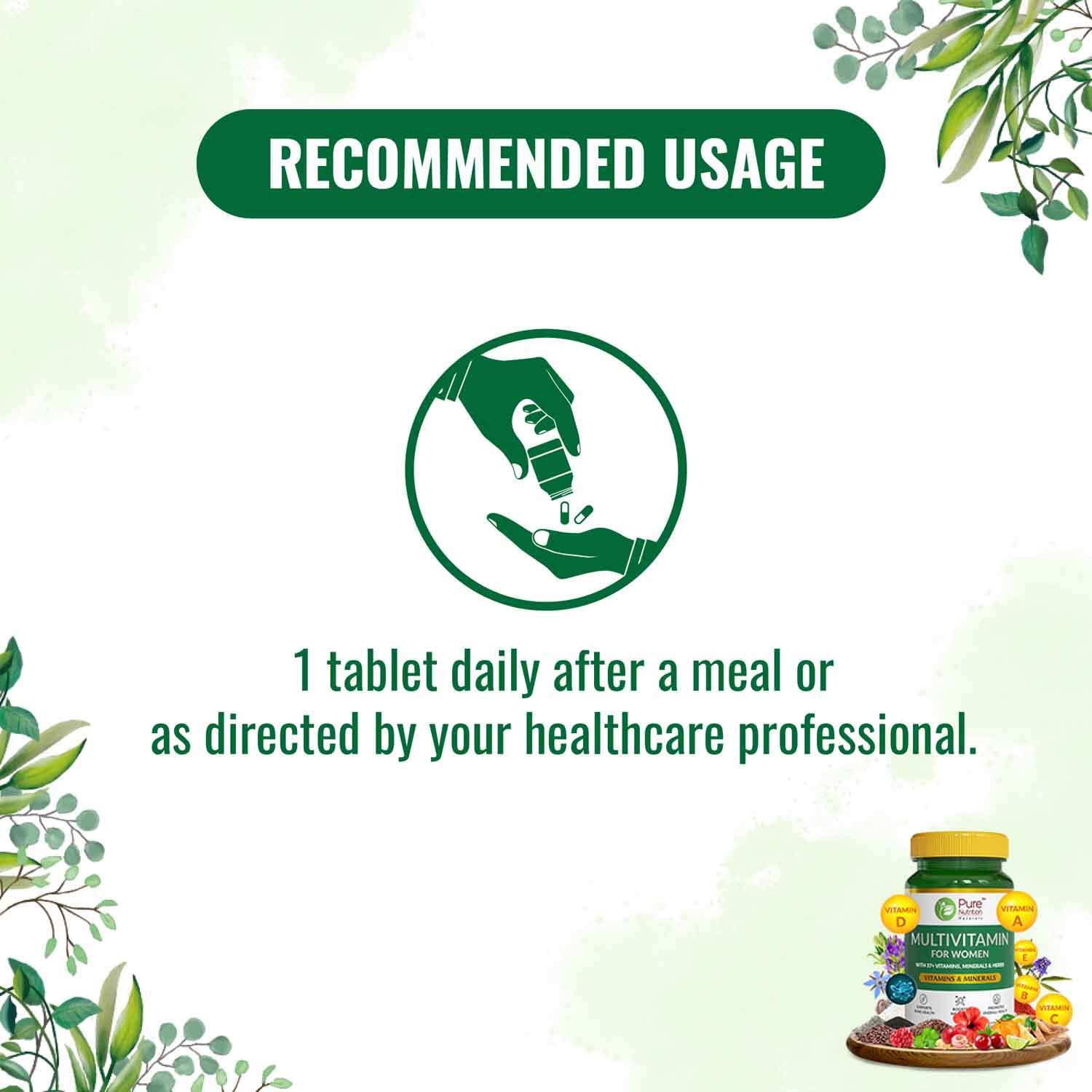 HomeHealth & PersonalDiet & NutritionHealth SupplementsPure Nutrition Multivitamin for Women (1500mg) 60 Veg Tabs with Biotin Iron Alfa Alfa Moringa Ginseng Fenugreek & Green Tea | Supports Immunity Energy Stamina Bone & Overall Health