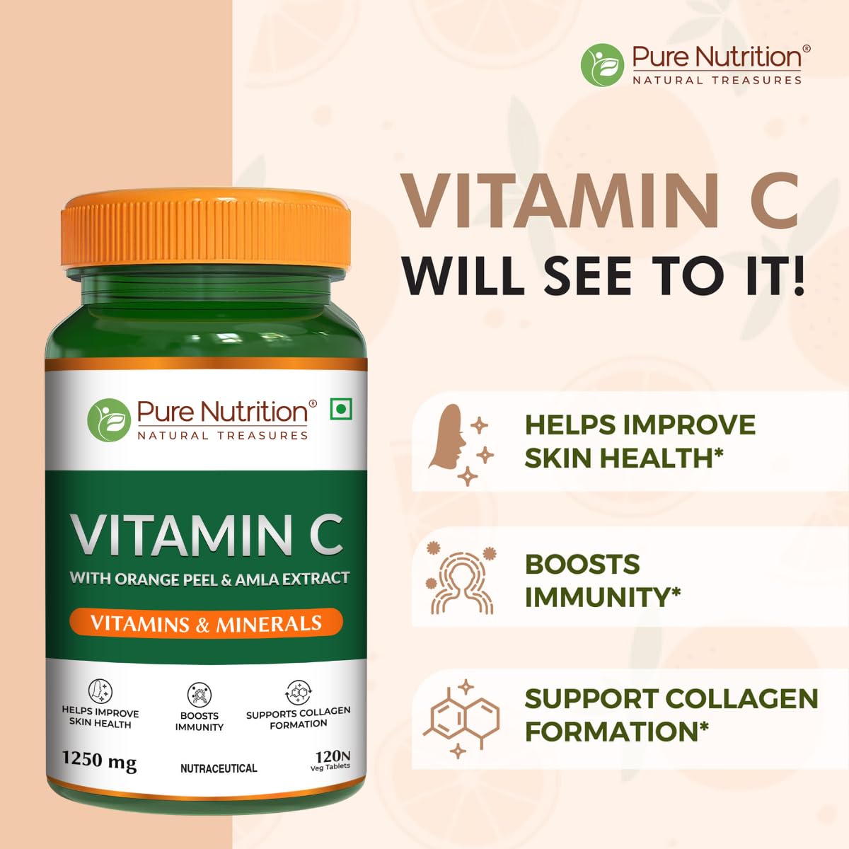 Pure Nutrition Vitamin C tablets are enriched with natural amla and orange peel extracts. Vitamin C is a potent antioxidant that helps prevent cellular damage and improves skin nail and bone health. Vitamin C tablets for immunity are a norm now. Since Vitamin C also helps reduce melanin and evens out skin tone one can rely on Vitamin C tablets for glowing skin. Meanwhile it is also essential for the formation of collagen. Collagen is found in the bones and skin and forms a protective layer in some of our vital internal organs. However our body cannot produce vitamin C on its own so we rely on external sources like Vitamin C supplements and a Vitamin C- rich diet to make sure our body receives the required nutrient in appropriate quantities. Loaded with the goodness of natural amla and orange peel extracts these immunity tablets are a perfect solution to promote overall health and beauty.