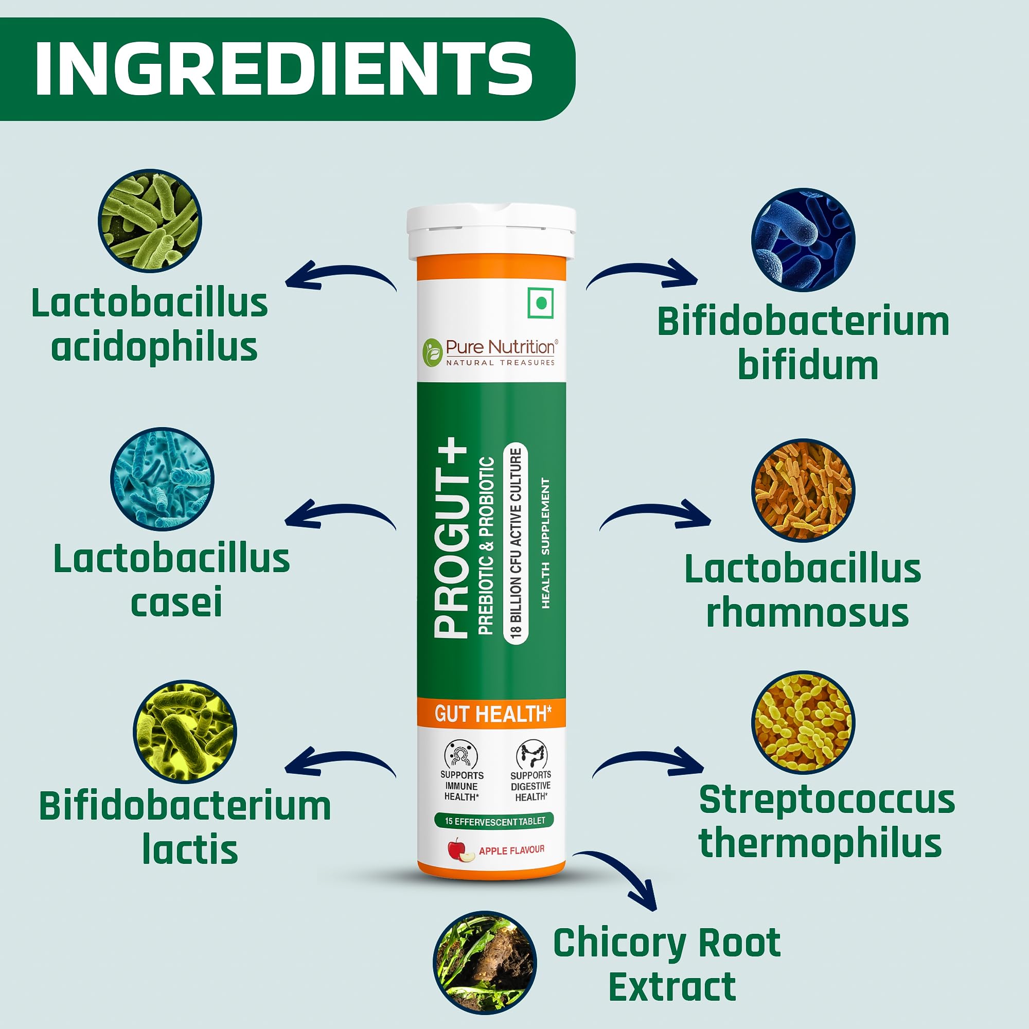 Support your digestive health and overall wellness with Pure Nutrition Progut+ a powerful blend of 18 billion CFU probiotics and prebiotics in a convenient effervescent tablet form. Each tablet is scientifically formulated to help relieve common digestive issues like indigestion constipation gas and bloating while also promoting immune health and nutrient absorption. Infused with a refreshing apple flavor Progut+ is easy to consumeâsimply dissolve one tablet in water and enjoy daily for optimal gut balance.
