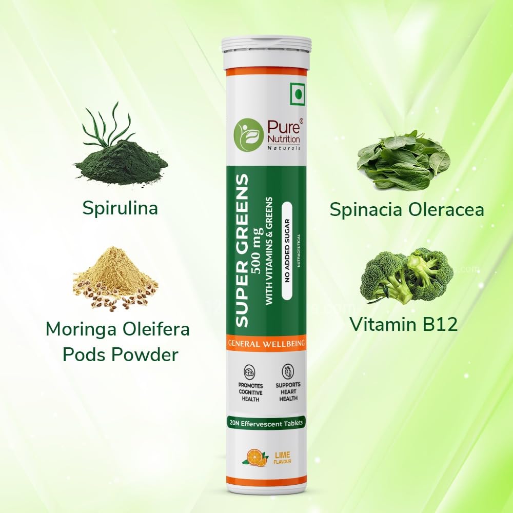 Pure Nutrition Super Greens 20 Effervescent Tablets with Moringa Spirulina Arjuna Leaf Extract Vitamin B1 B3 B5 B6 B12 | 14+ Vitamins Herbs Superfoods & Antioxidants for Immunity & Overall Wellbeing