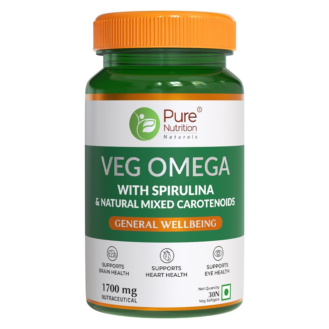 PURE NUTRITION VEG OMEGA with Spirulina and Natural mixed Carotenoids offers pure vegetarian Omega-3 DHA 1000 mg per serving. It is obtained from microalgae the richest source of DHA which enters the fishes through the biological cycle. The supplement com