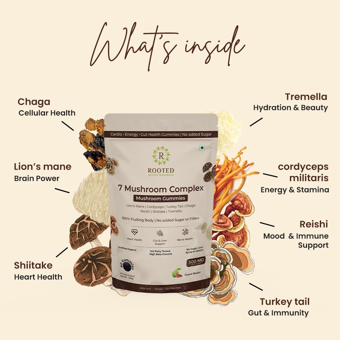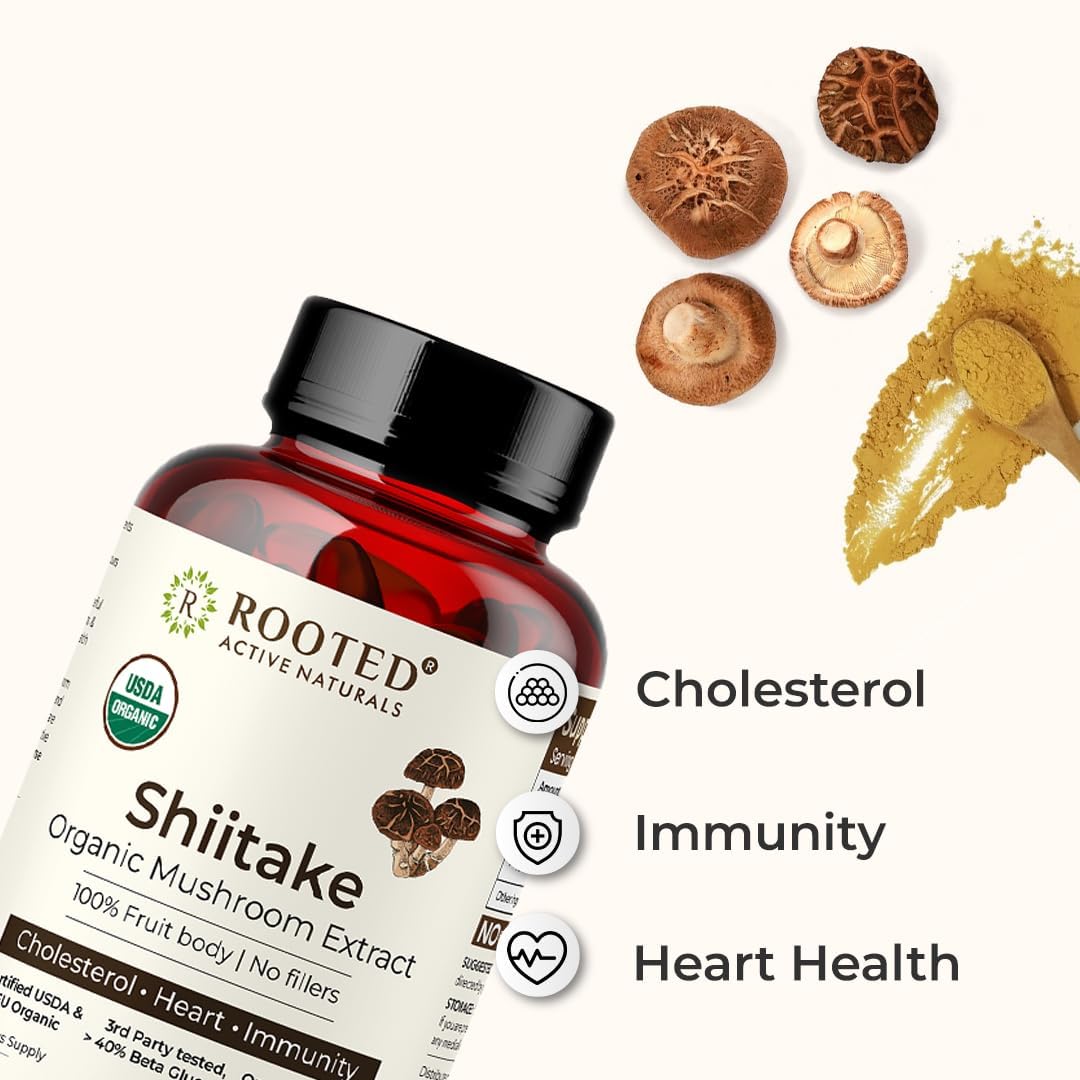 Promote heart health immune function and overall vitality with Rooted Active Naturals Shiitake Capsules and 7 Complex Gummiesa potent blend of organic mushroom extracts for daily wellness. Shiitake Capsules (60 Caps) 100% fruiting body extract rich in beta-glucans designed to support cholesterol levels cardiovascular health and immune balance. 7 Complex Gummies (60 Gummies) A sugar-free guava-flavored blend of seven powerful mushrooms: Lion Mane Cordyceps Turkey Tail Reishi Chaga Shiitake and Tremella for complete wellness.