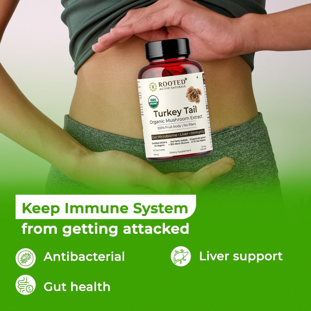 Support your gut liver and immune system with Rooted Active Naturals Turkey Tail Capsules and 7 Complex Gummiesa powerful combination of organic mushroom extracts designed for daily wellness. Turkey Tail Capsules (60 Caps) Made from 100% fruiting body extract rich in beta-glucans to promote gut health liver function and immune balance. 7 Complex Gummies (60 Gummies) A sugar-free guava-flavored gummy featuring Lion Mane Cordyceps Turkey Tail Reishi Chaga Shiitake and Tremella for full-spectrum support.