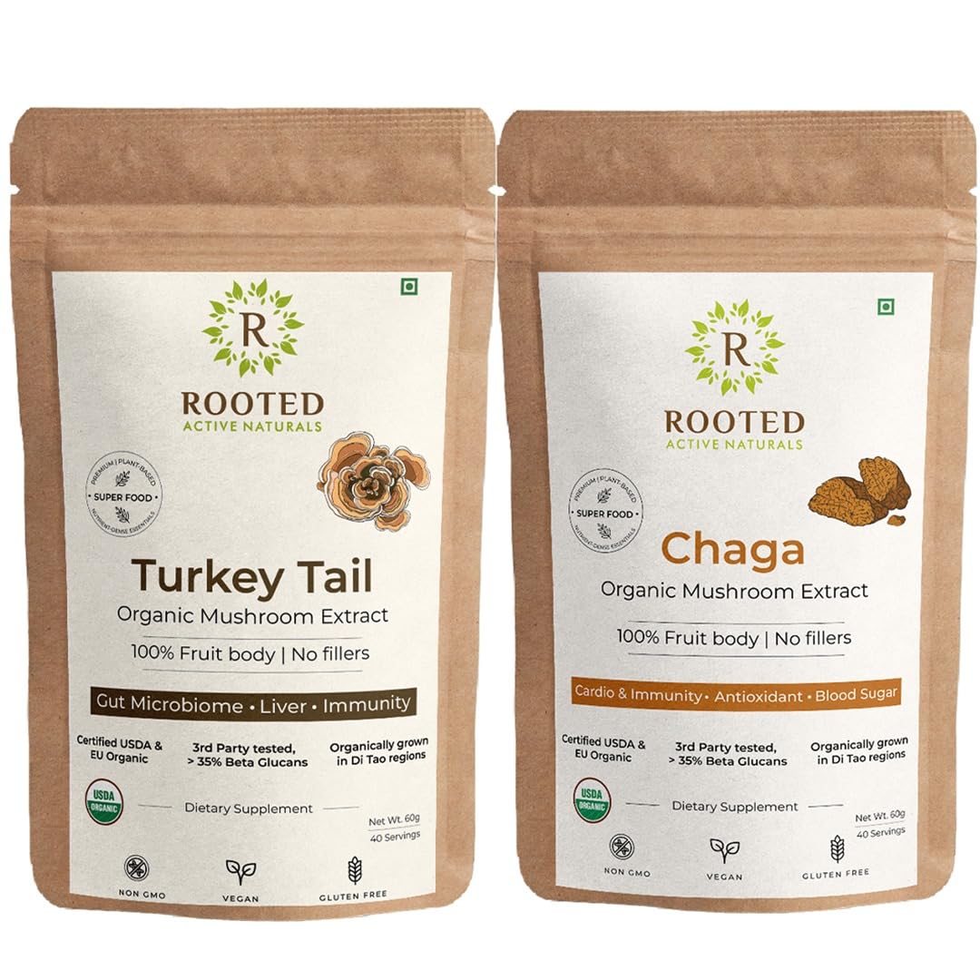 Boost your immune system and overall vitality with Rooted Active Naturals' Turkey Tail & Chaga Mushroom Powder. This powerful duo combines two of nature most potent functional mushrooms to provide gut health support antioxidant protection and immune-boosting benefits. Turkey Tail Mushroom Powder A rich source of prebiotics & beta-glucans Turkey Tail supports gut microbiome health digestion and immune function. Chaga Mushroom Powder Known as the âKing of Medicinal Mushroomsâ Chaga is packed with antioxidants polyphenols and adaptogenic compounds to promote cellular health and overall wellness. Both powders are 100% pure organically sourced and free from fillers additives or artificial ingredients.