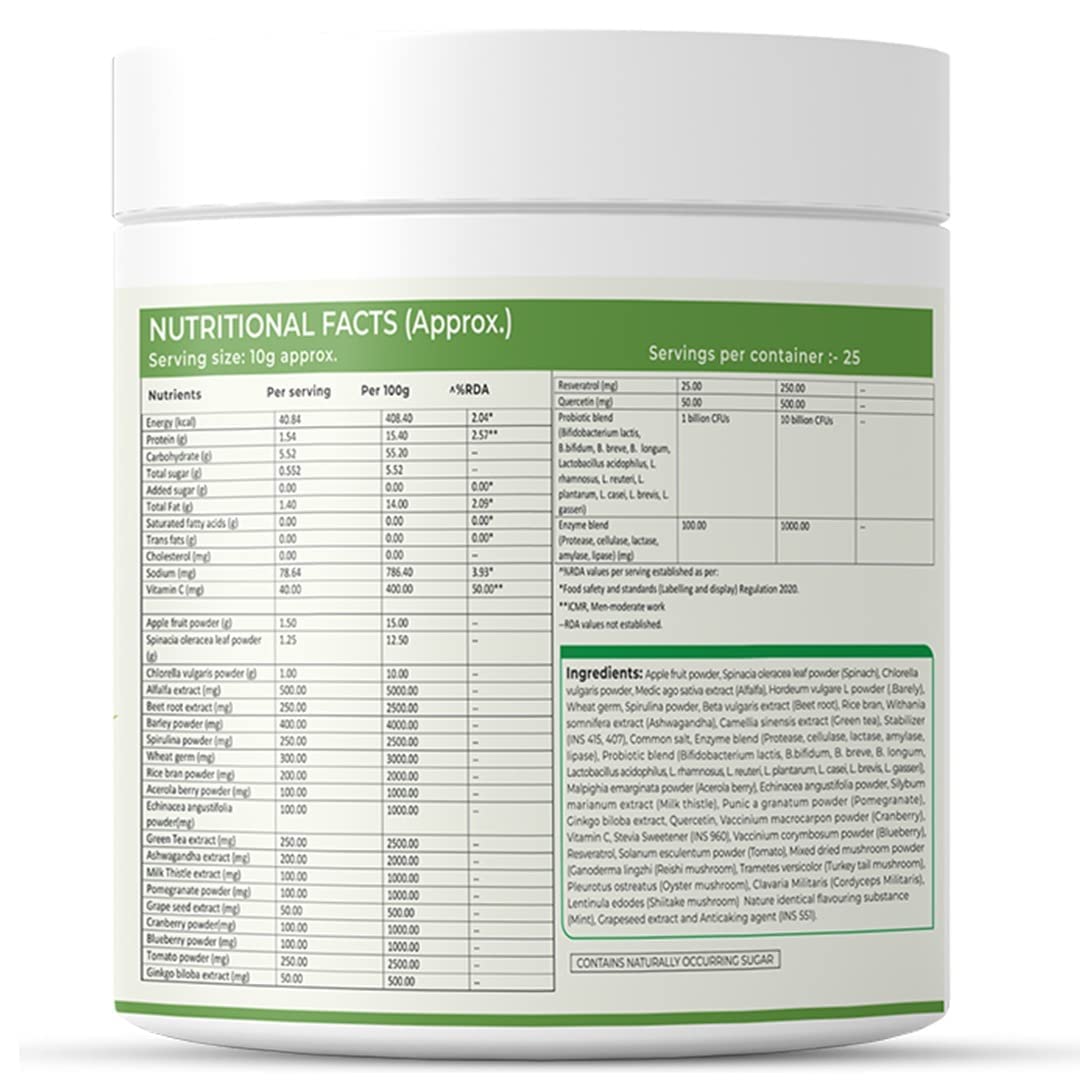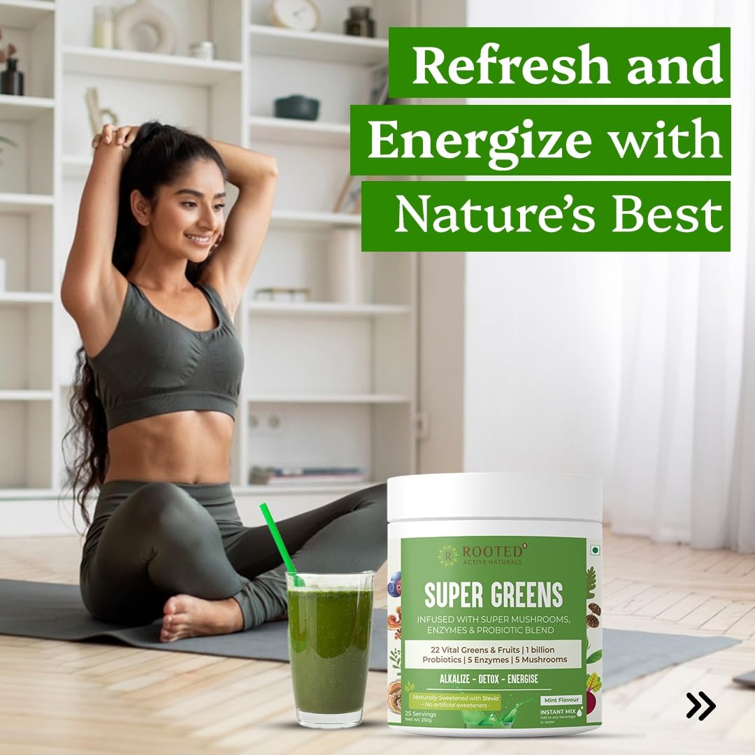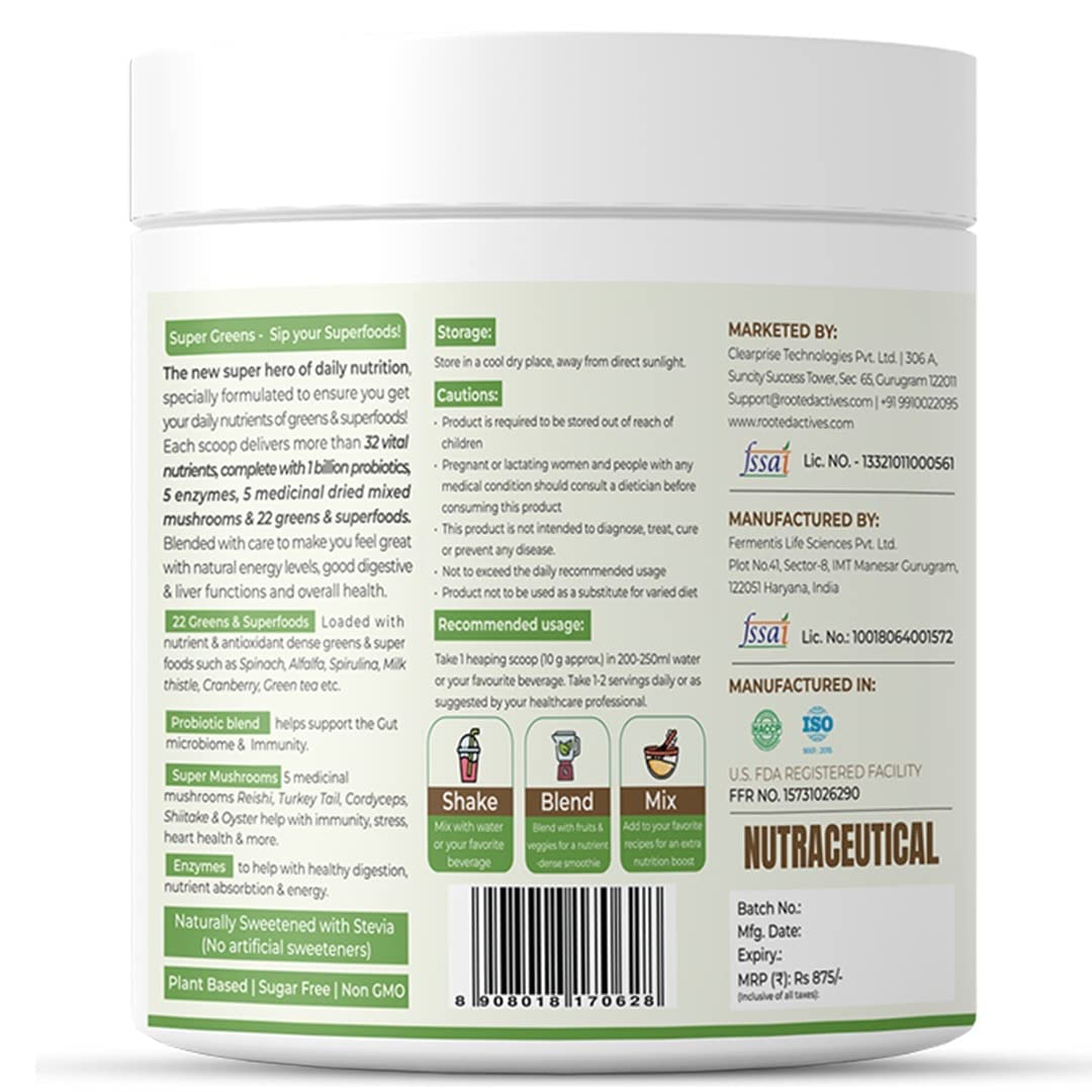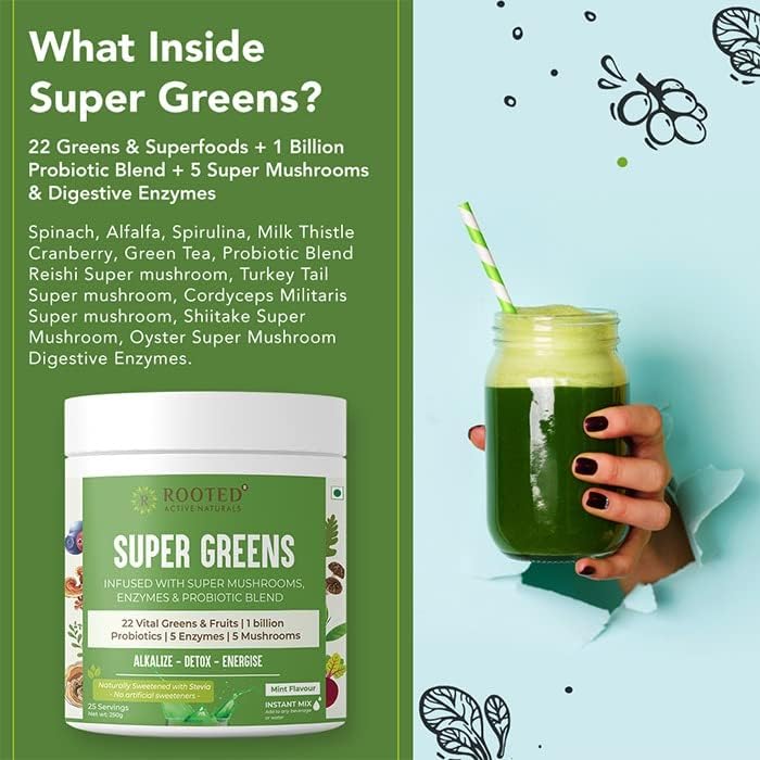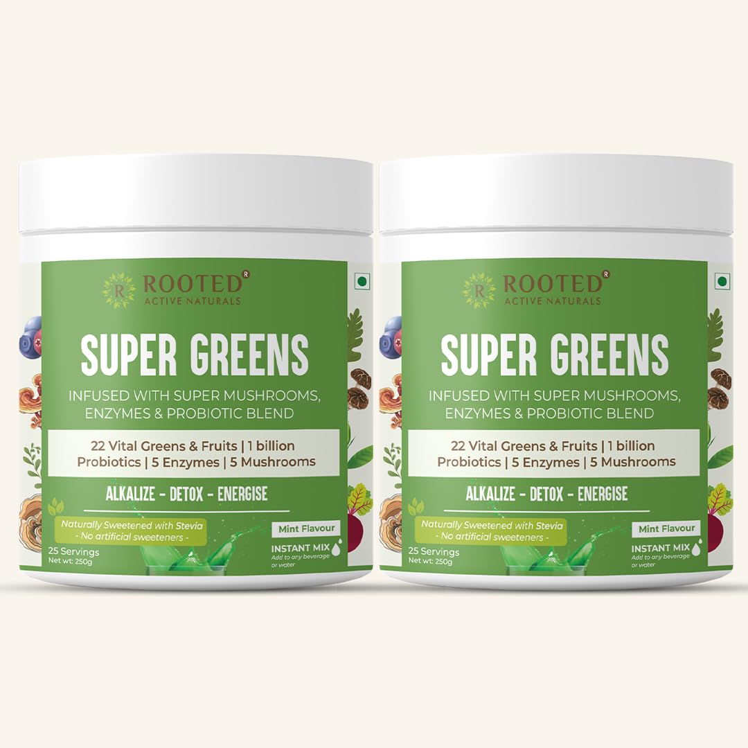 Rooted Actives Superfood Greens Mushrooms & Herbs blend| (250 g) 22 Daily Greens & Fruits 5 Mushrooms Probiotics & Enzymes | Rich in vitamins minerals iron fiber & antioxidants (Pack of 2)