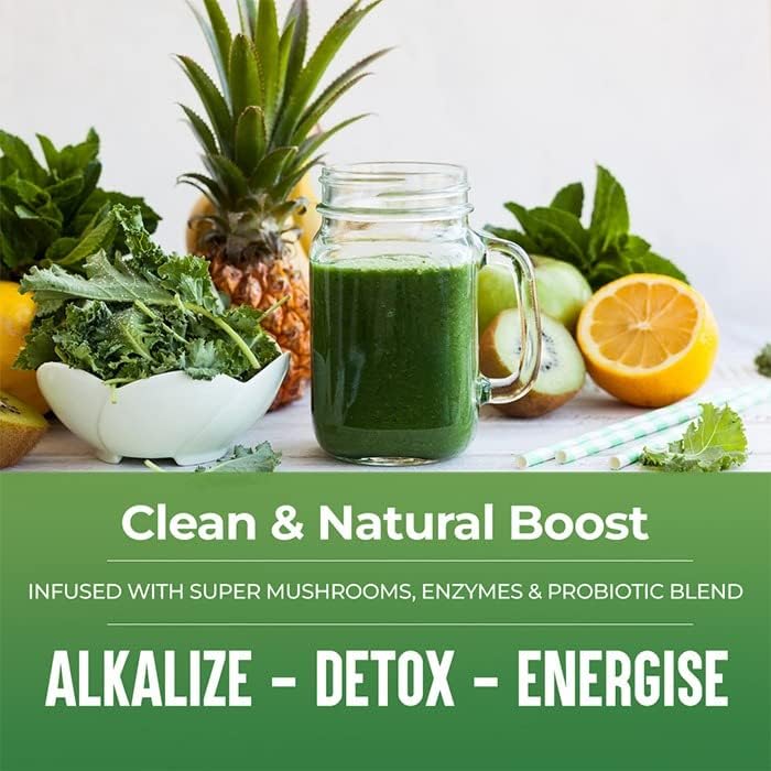 Nutrient-Dense Blend: Packed with 22 vital greens fruits 5 medicinal mushrooms digestive enzymes and probiotics for optimal health.