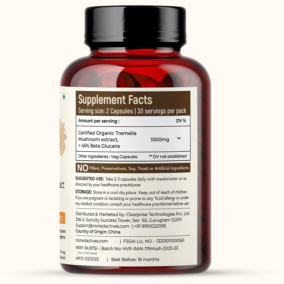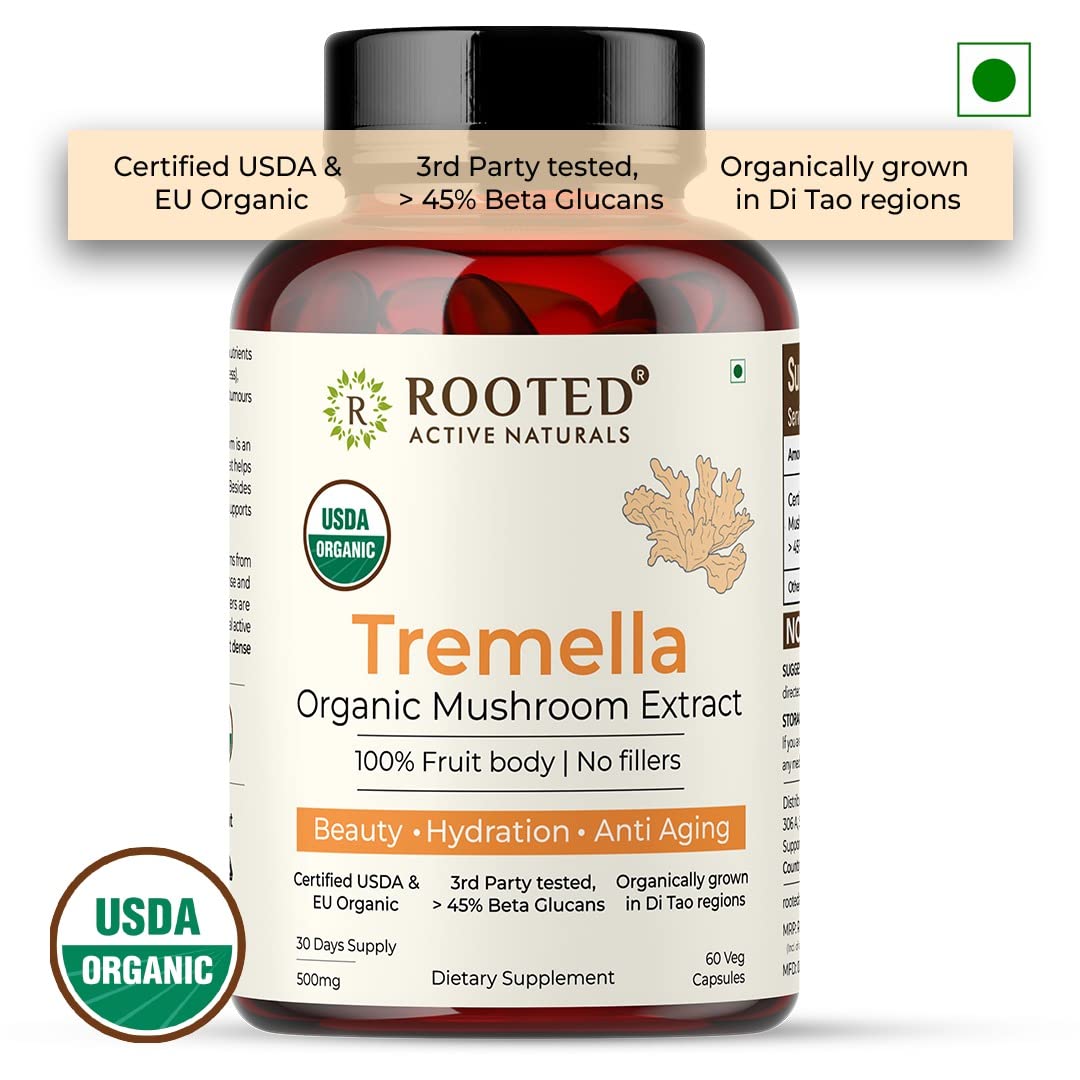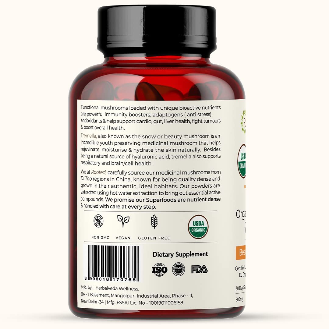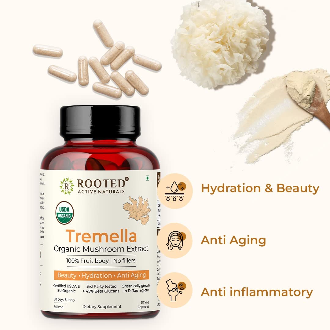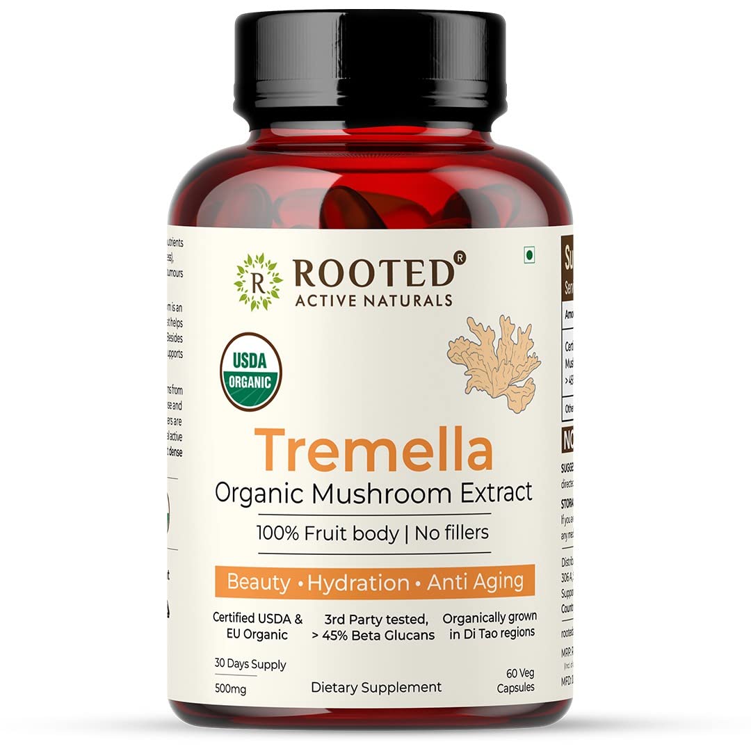Rooted Actives Tremella Mushroom Extract (60 Veg caps 500 mg) |Beauty Skin Glow Collagen booster Hyalyronic acid Hydration| USDA Organic 45% Beta Glucans