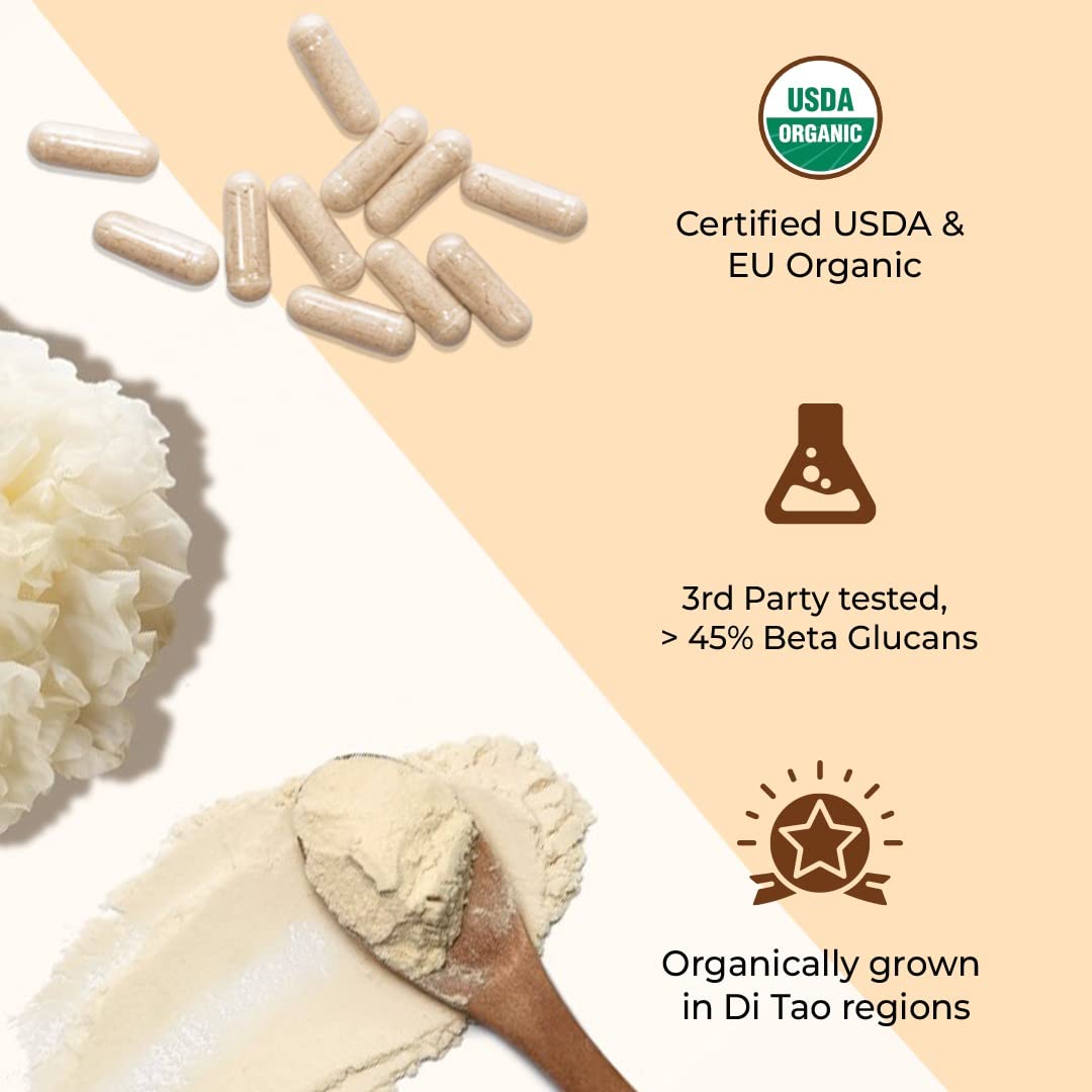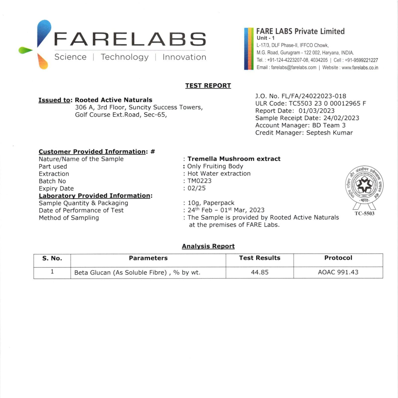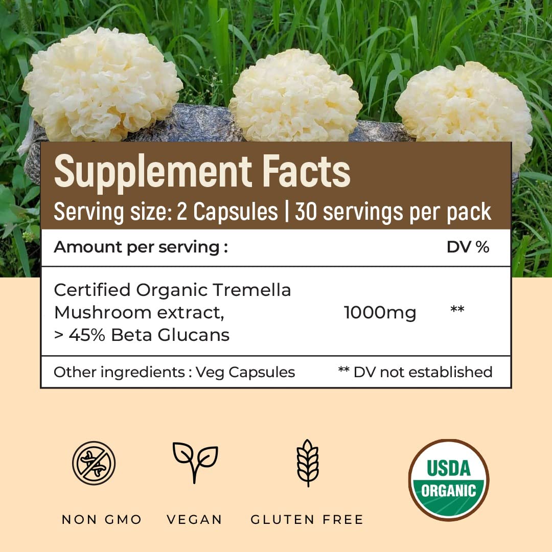 Pure extracts: Concentrated extract powder from 100% fruiting bodies of Organic Tremella mushroom ( Tremella fuciformis). No mycelium or fillers used Lab tested verified levels of beta glucans