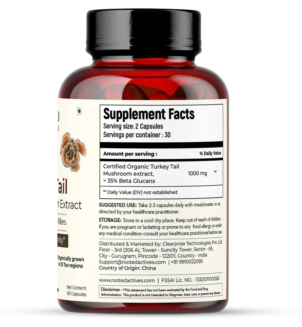 Rooted Active Turkey Tail Mushroom Capsules (Pack of 4 60 caps each) contain 100% whole mushroom powder carefully sourced and processed for quality. These vegan non-GMO and gluten-free capsules are free from artificial fillers or additives offering a clean-label choice. Designed for convenience these capsules require no mixing or brewingsimply take with water. The bulk pack of 4 provides great value and an extended supply for consistent use.