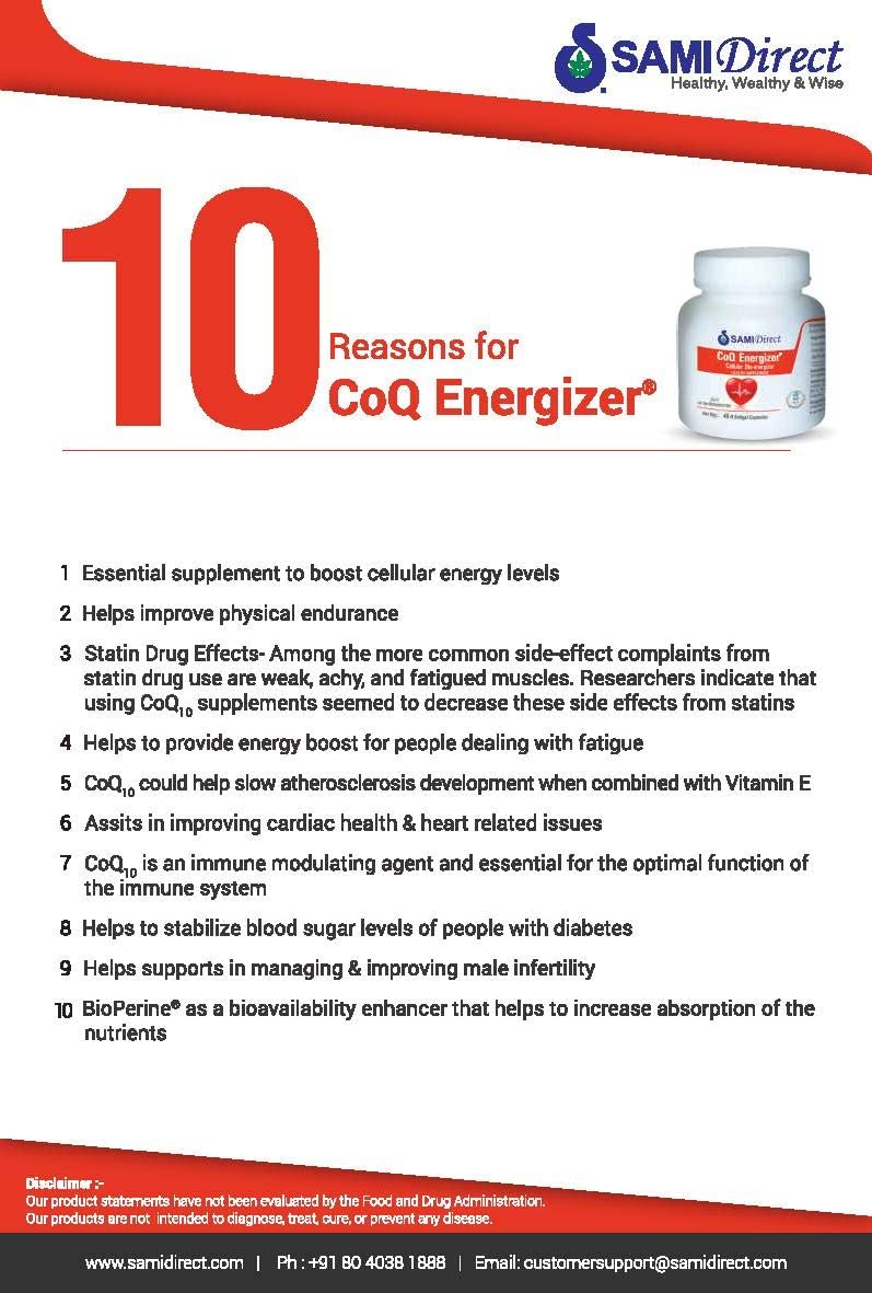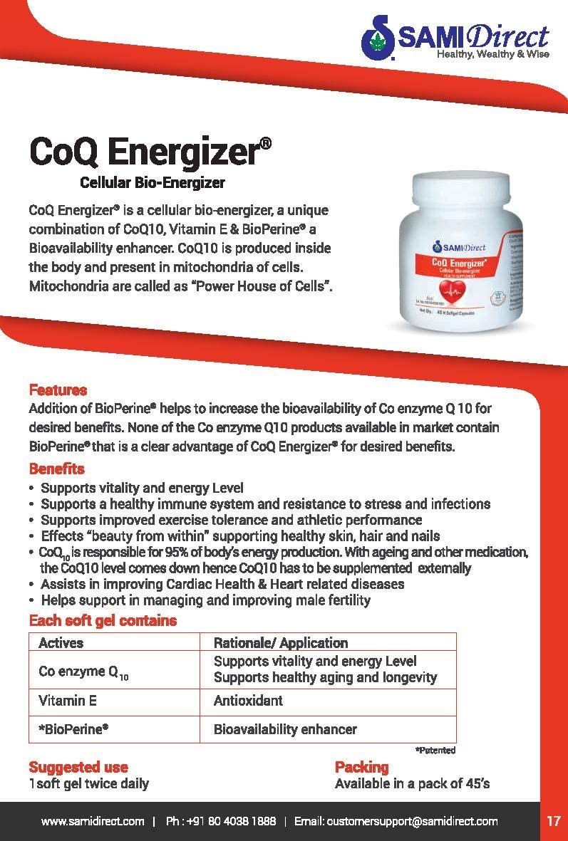 CoQ Energizer is a cellular bio-energizer a unique combination of CoQ10 Vitamin E & BioPerine a Bioavailability enhancer.CoQ10 is produced inside the body and present in mitochondria of cells.Mitochondria are called as âPower House of Cellsâ