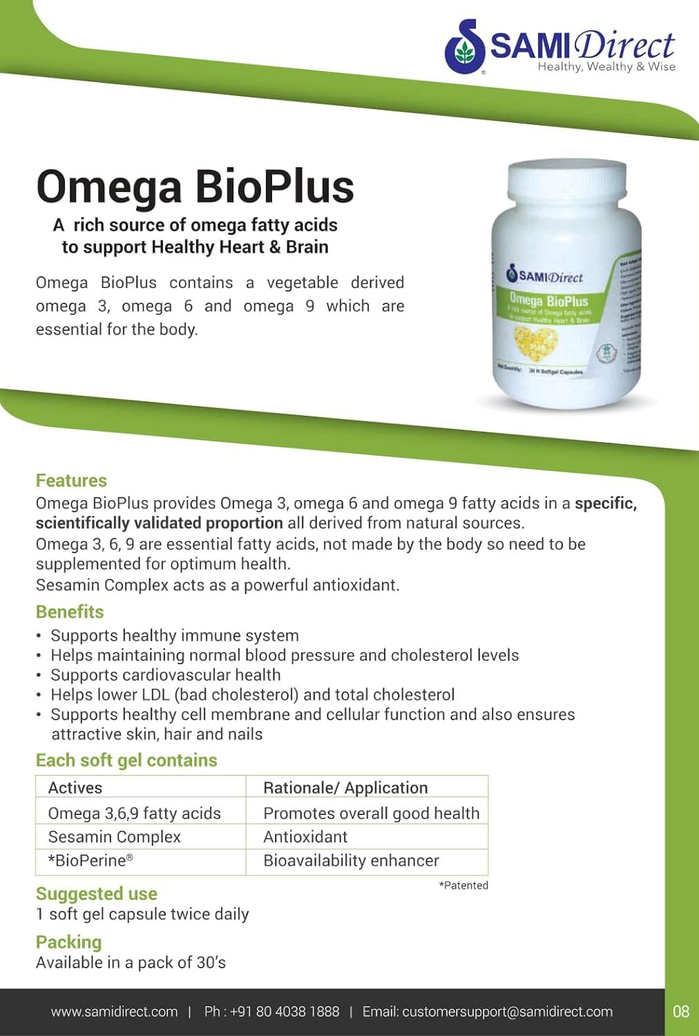 Omega BioPlus is a nutritional supplement with a unique blend of natural vegetable sourced Omega-3 6 and 9 fatty acids. It provides the natural essential fatty acids that our body requires. The fatty acids composition is combined with sesame oil antioxidants and a bioavailability enhancer BioPerine. Omega fatty acids are a health requirement for every man woman and child young and old as they form crucial building blocks to maintain a healthy body. Essential fatty acids are required for energy production in the body cardiac function health of hair skin and nails hormone production brain function and for the integrity of the very structure of cells.