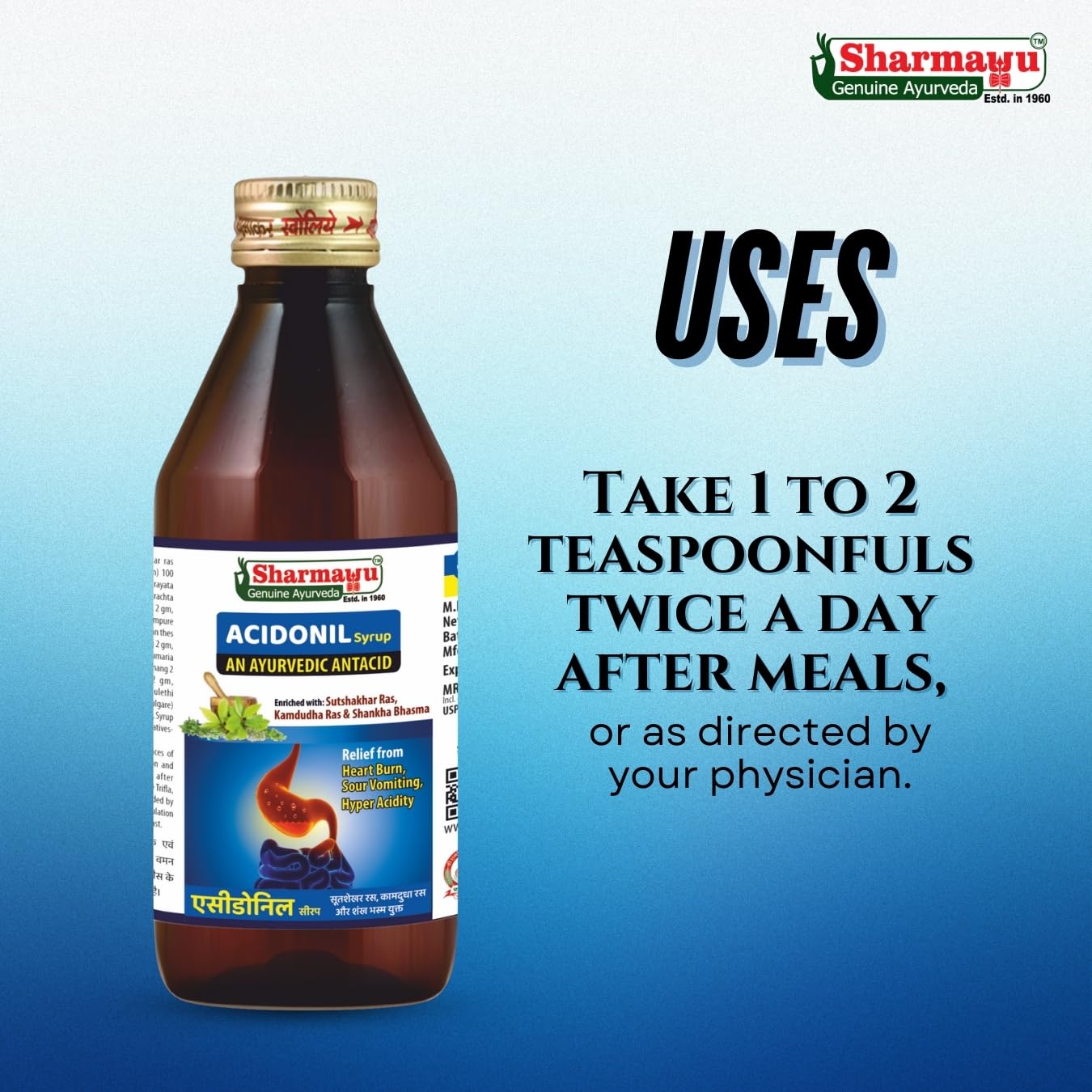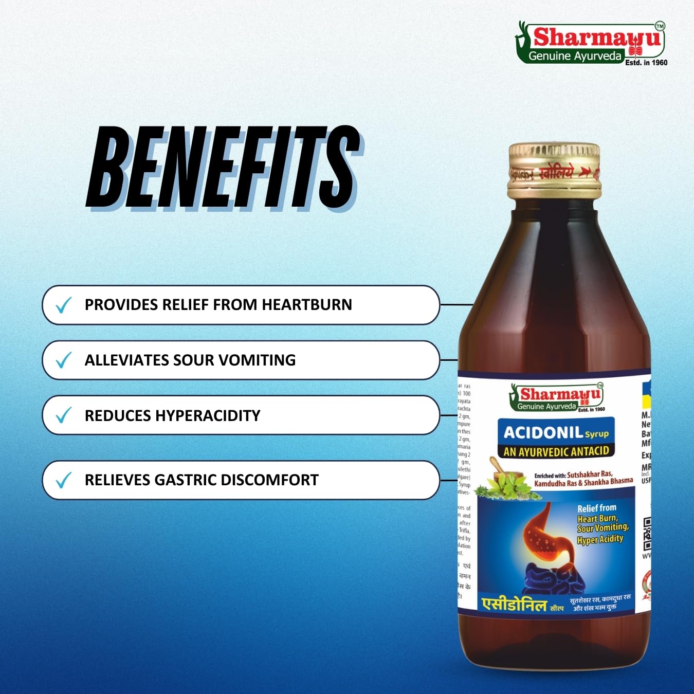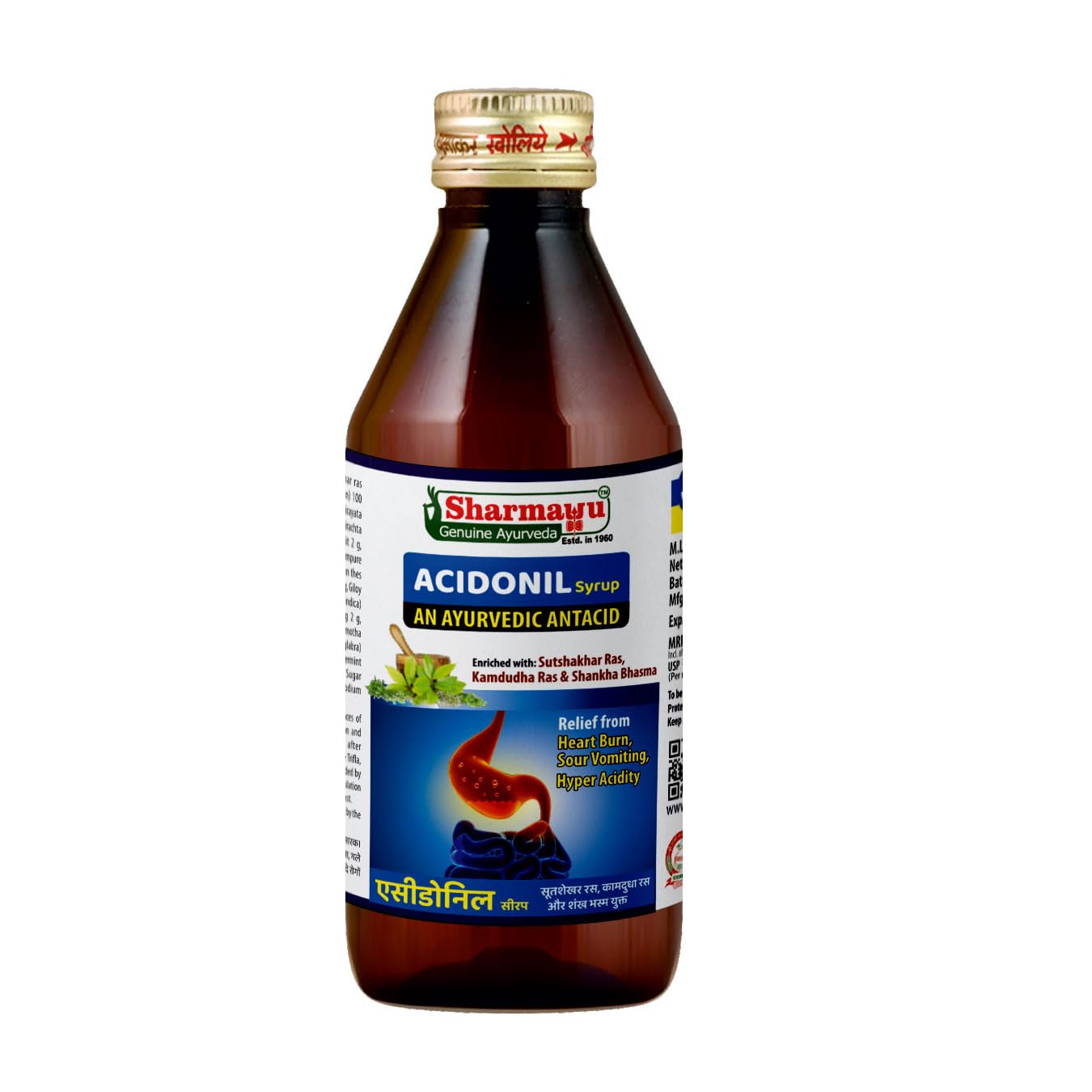 Say goodbye to the discomfort of acidity and heartburn with Acidonil Syrup – a powerful Ayurvedic antacid formulated to naturally relieve hyperacidity gastric irritation gas and related digestive issues. Crafted using time-tested Ayurvedic herbs Acidonil works by neutralizing excess stomach acid soothing the inner lining of the stomach and promoting healthy digestion. It is effective in managing gas acid reflux peptic ulcers duodenal ulcers bloating and that persistent burning sensation in the stomach. Whether you're dealing with chronic acidity or occasional heartburn Acidonil Syrup offers a gentle yet effective solution – without the side effects of chemical antacids. ???? Key Benefits Provides fast relief from acidity heartburn gas & bloating Helps in the treatment of hyperacidity and hyperchlorhydria Effective against gastric and duodenal ulcers Reduces the feeling of nausea and fullness in the abdomen Supports the body’s natural digestive balance 100% Ayurvedic & natural safe for long-term use