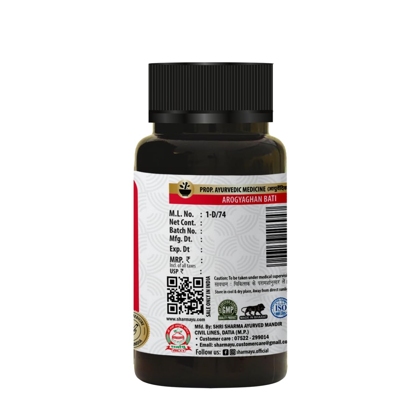 Sharmayu Arogyaghan Bati (Arogyavardhini Bati) is a potent Ayurvedic formulation that promotes overall digestive health detoxifies the body and supports liver and spleen function. Enriched with time-tested herbs like Kutki Triphala Neem and Shuddha Shilajit this supplement aids in relieving constipation acidity bloating and abdominal discomfort. It also purifies the blood and helps manage obesity skin disorders anemia and sluggish metabolism. Its detoxifying action supports liver rejuvenation and improves overall vitality. Ideal for those seeking a natural solution for digestion weight control and skin wellness. Made from 100% Ayurvedic ingredients this tablet is safe for regular use and manufactured in a GMP and ISO-certified facility. Suitable for adults of all ages.
