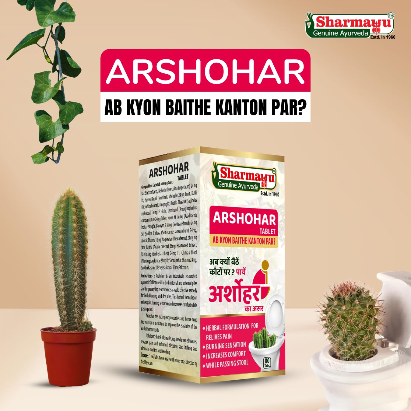 Sharmayu Arshohar Tablet is a powerful Ayurvedic solution specifically formulated to provide relief from piles (also known as hemorrhoids or “arsha”). Whether you are experiencing internal or external piles this herbal remedy is designed to tackle the root causes not just the symptoms. It combines the ancient wisdom of Ayurveda with modern manufacturing to deliver safe effective and long-lasting results. The unique formulation helps reduce the burning sensation itching and pain typically associated with piles. It also assists in shrinking swollen veins and managing bleeding during bowel movements. Unlike synthetic medications that often offer temporary relief and may have side effects Arshohar Tablet uses natural herbs that are gentle on the body and suitable for long-term use.