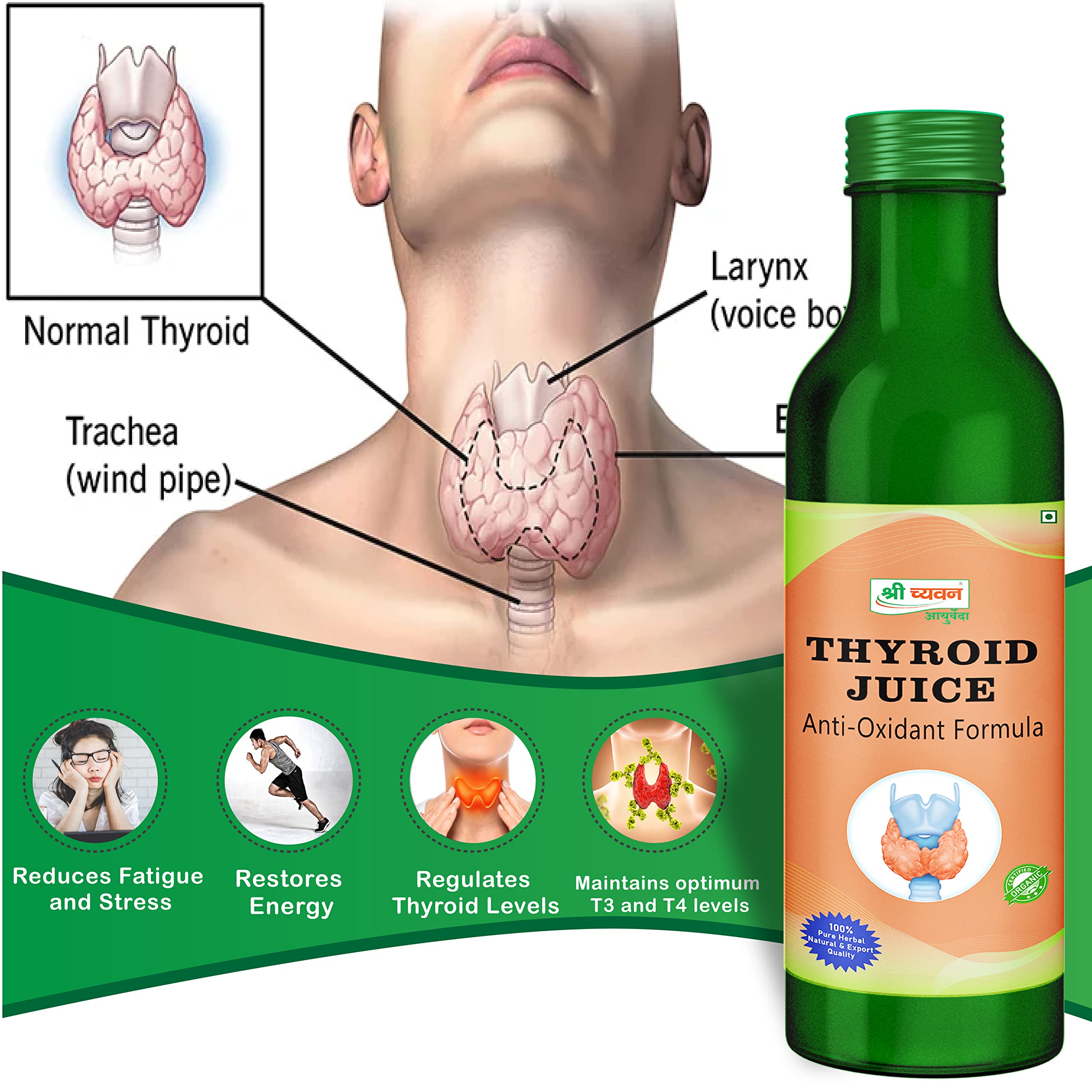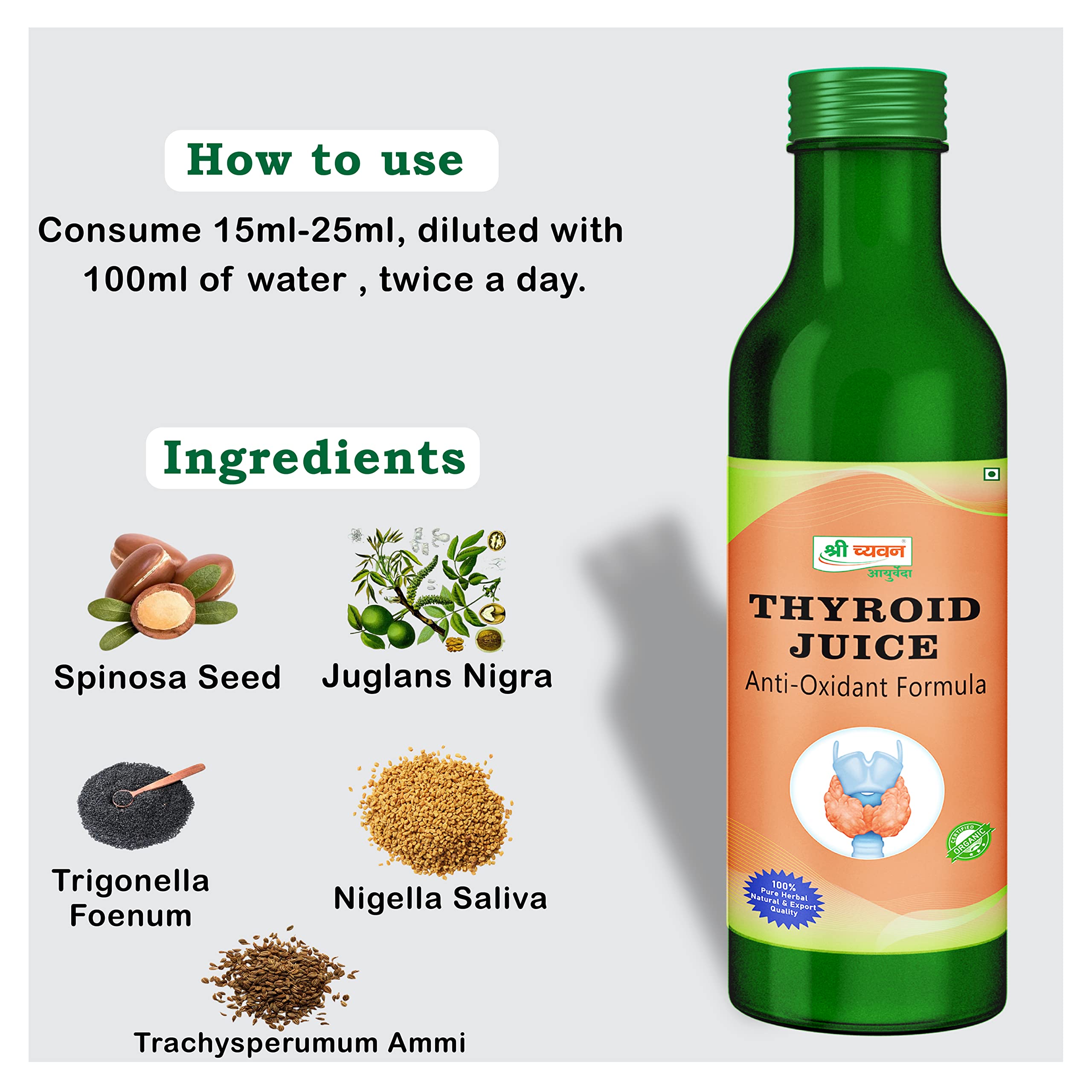It is enriched with mineral salts and also supports the central nervous system with powerful electrolytes. It is an amalgamation of natural herbs and ingredients which are known to have therapeutic properties to maintain adequate Thyroid levels in your body and support proper functioning. Ingredients: It consists of Trigonella Foenum Nigella Saliva Trachysperumum Ammi Boerhaavia Diffuse Tribulus Terrestris Solanum Nignum Withania Somnifera Zizyphus Spinosa Seed Juglans Nigra Coelus Forskohlu.