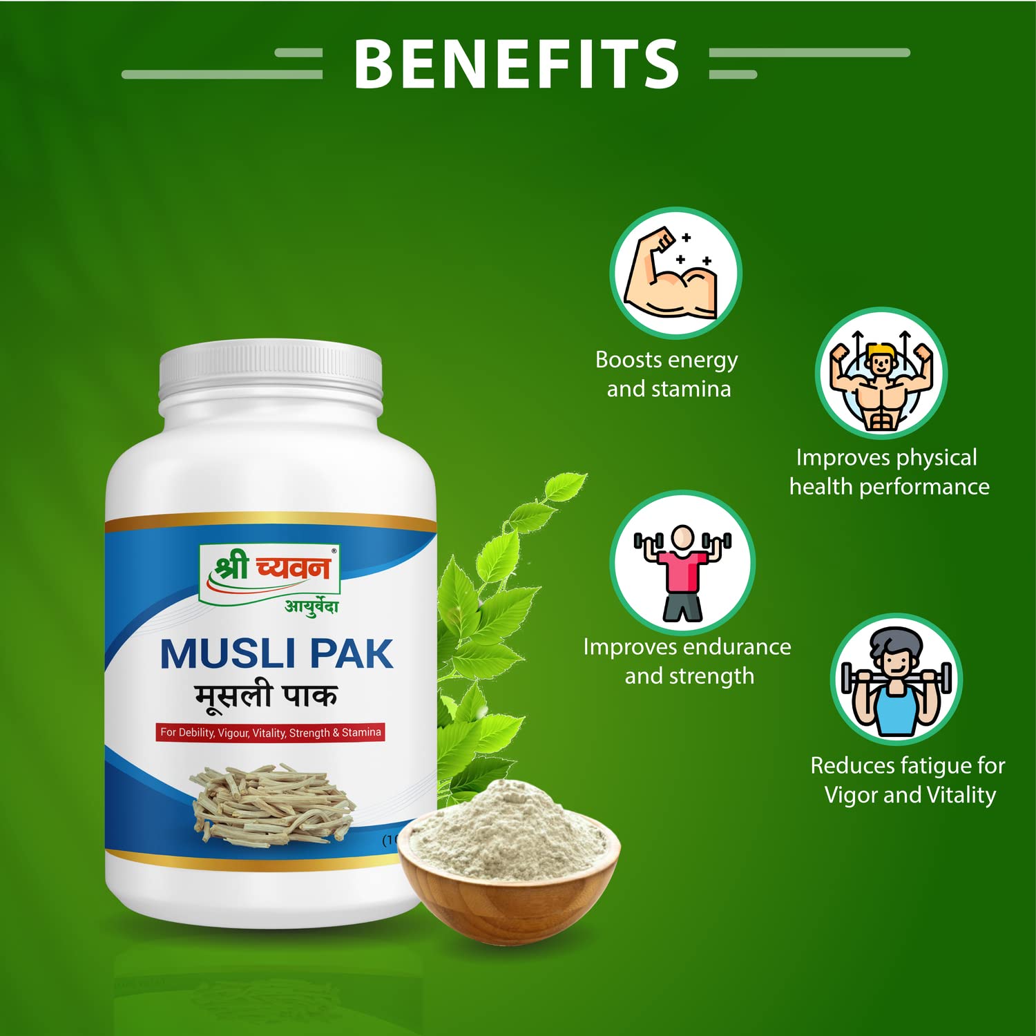 Shri Chyawan Ayurveda's Musli Pak is an ayurvedic powder curated for restoring physical strength and acts as a body nourishment supplement.
