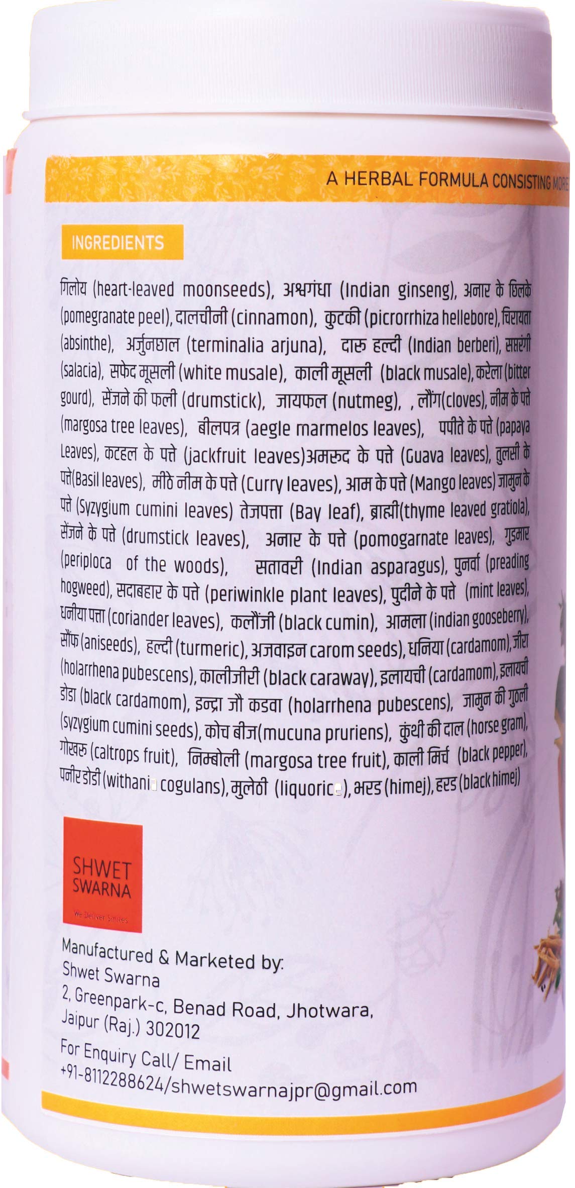 A combination of 50+ Natural Safe and Chemical free ingredients including Tulsi MoringaWhite Musli Black Musli Ashwagandha Giloy Mulethi Arjunchaal Gokhru Dalchini Kali Mirch Gokhru Amla Brahmi Gokhru etc. with no added preservatives Its ingredients are proven to boost the immune system removal of toxic elemets. The ingredients used in the product are safe and are used extensively for home remedies as well. Immune Rajas is a proprietary health supplement not for medicinal use and it does not cure any disease.