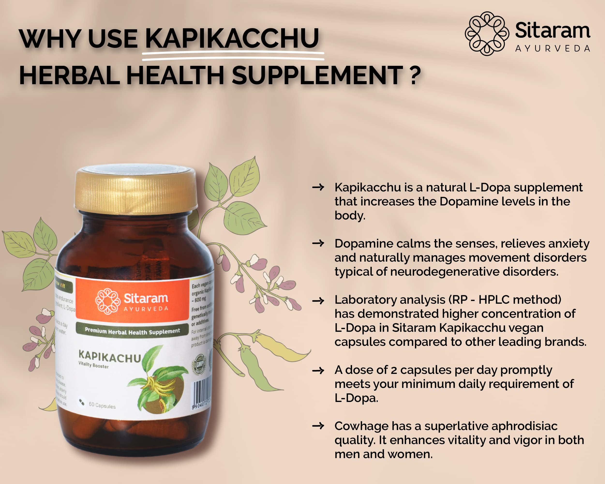 Sitaram Ayurveda Kapikachu Capsules 60 Nos | More Potent 600 MG Extract | Kerala Ayurvedic Kapikachhu Capsules | Naturally Boosts Dopamine Levels In The Body | Relieves Anxiety And Stress.