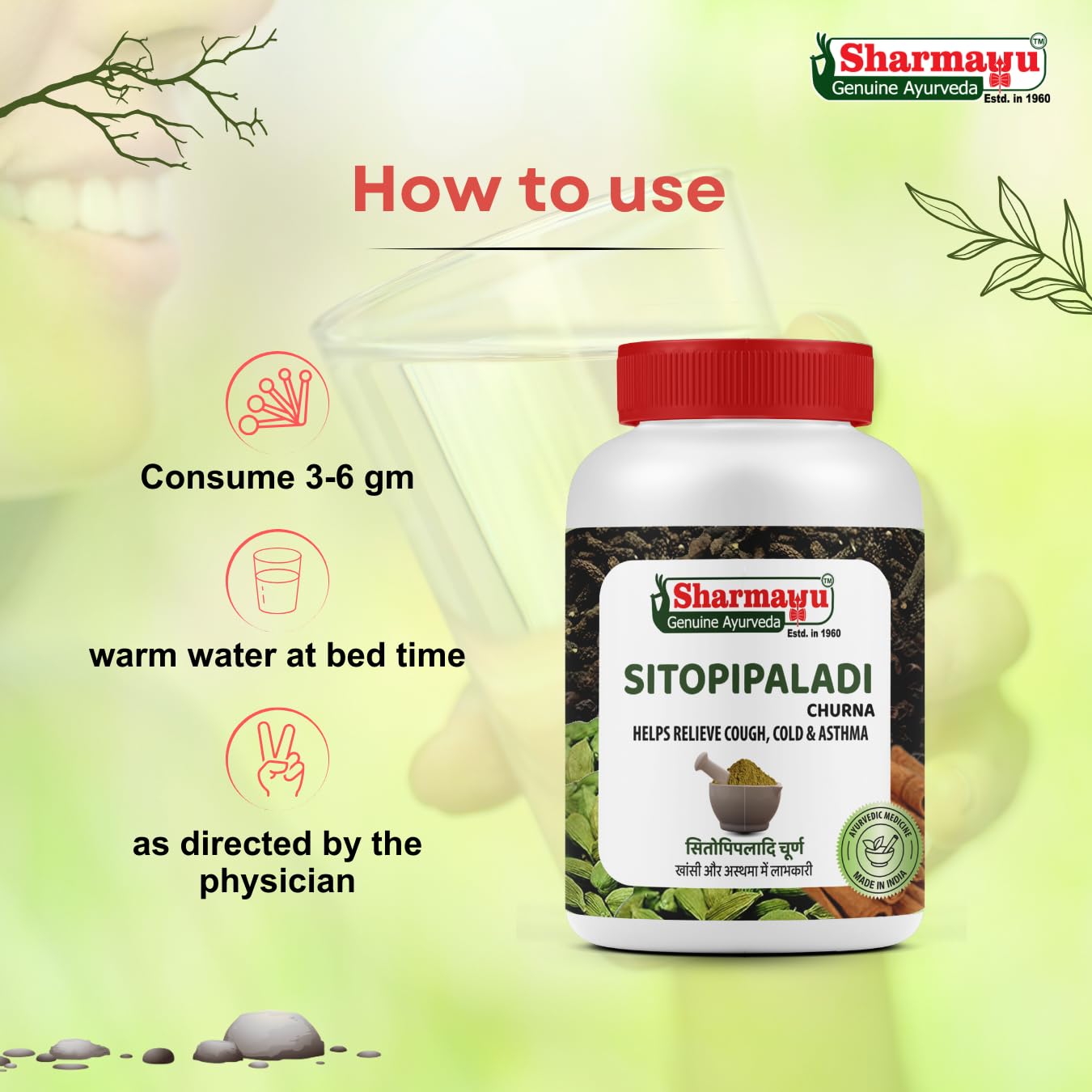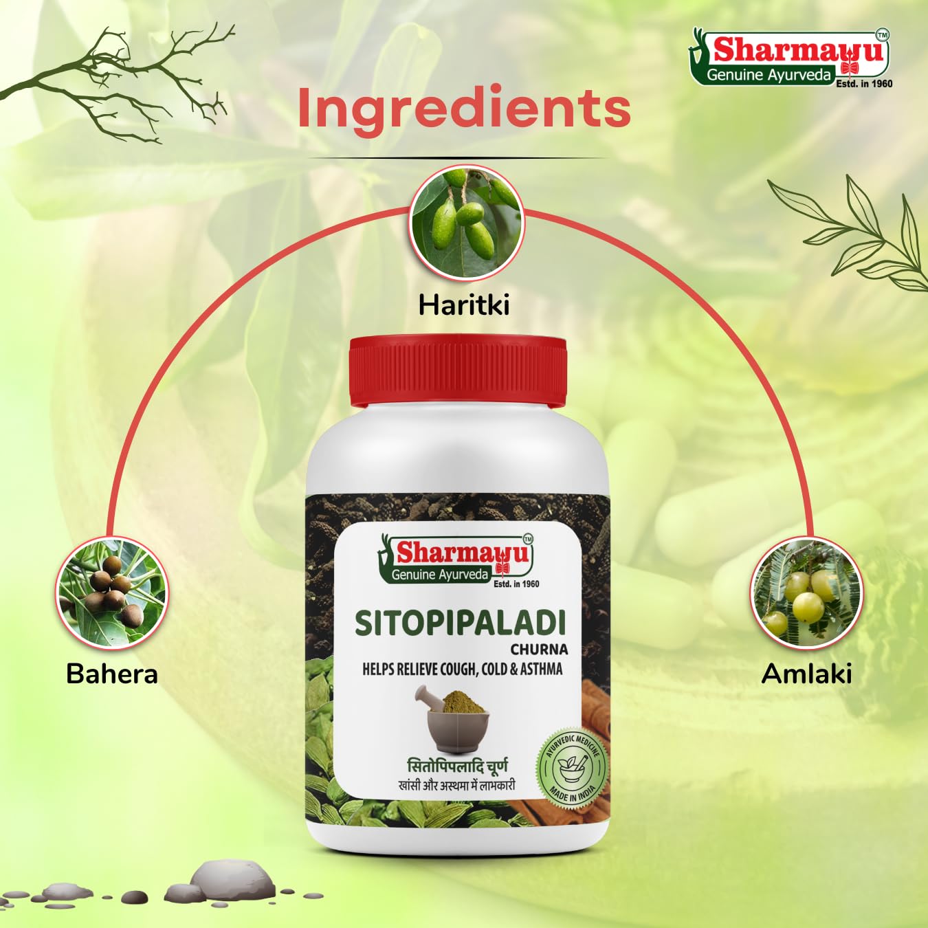 Sitopaladi Churna is a classical Ayurvedic formulation by Shri Sharma Ayurved Mandir crafted using a unique blend of traditional herbs like Amlaki (Emblica officinalis) Haritaki (Terminalia chebula) and Bahera (Terminalia bellirica). This herbal churna is renowned for its effectiveness in managing cough cold asthma and various respiratory issues. Carefully prepared under expert supervision Sitopaladi Churna works as an excellent expectorant and helps soothe throat irritation and congestion. It not only strengthens the respiratory system but also improves digestion and boosts appetite. Additionally it helps in managing body heat promotes better bowel movements and is also beneficial in certain eye-related ailments due to its detoxifying properties. To achieve maximum benefit it is advised to take 3-6 grams of this churna with warm water at bedtime or as directed by a qualified physician. Made from high-quality natural ingredients Sitopaladi Churna is a trusted herbal solution for long-term respiratory wellness. Perfect for those seeking a natural and side-effect-free alternative to over-the-counter medicines itâs a must-have in your Ayurvedic health kit.