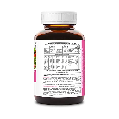 Live your best life from the inside out with a complete multivitamin for women specially formulated with nutrients that address your health concerns. 100% RDA OF 13 Essential Vitamins And Minerals With Added Vital Herbs. How to Use? 1 capsule after food twice a day or as directed by a physician. Key Ingredients: Premix (Myo-inositol Minerals & Trace Elements Vitamins Shatavari Extract Powder Alpha Lipoic Acid Ginseng Extract Grape Seed Extract Cranberry Extract Papain. Caution: Not to exceed the recommended daily dosage. Pregnant or nursing mothers children below 18 years of age and individuals with known medical conditions should consult their healthcare professionals before using this product. Keep out of reach of children. This product is not to be used as a substitute for a varied diet. Store in a cool & dry place away from heat & light.