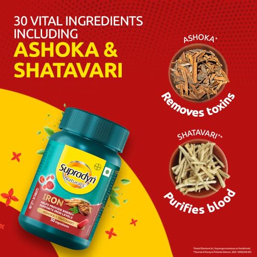 Supradyn Naturals Iron (30 tablets) with 3X Iron, Ashoka, Shatavari, Zinc, Vitamin C, Folic Acid, 30 vital nutrients, Supports Blood Health & Provides Energy, Veg