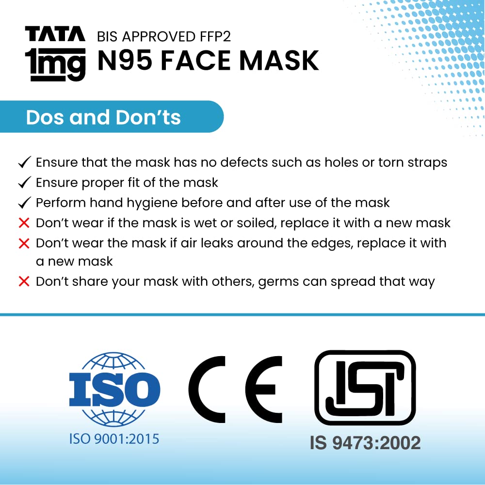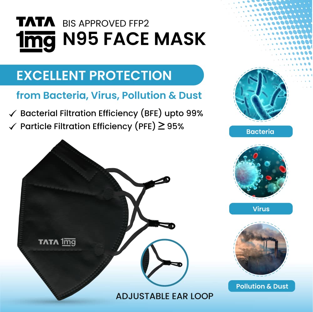 Product highlights1. It offers advanced 5 layer protection from harmful elements2. It is an Anti-pollution and anti-fog face mask3. This face mask provides excellent breathability4. Hypoallergenic soft and comfortable5. It is with adjustable earloops for better fit and comfort6. It has a Bacterial Filtration Efficiency (BFE) of upto 99%7. It has a Particle Filtration Efficiency (PFE) ⥠95%Tata 1mg BIS approved FFP2 N95 Mask with adjustable Ear Loop Pack of 2: comprises 5 protective layers. This mask has been rigorously tested and provides excellent protection against bacteria viruses pollution and dust. It has a Bacterial Filtration Efficiency (BFE) of up to 99% and Particle Filtration Efficiency (PFE) of up to 95%.