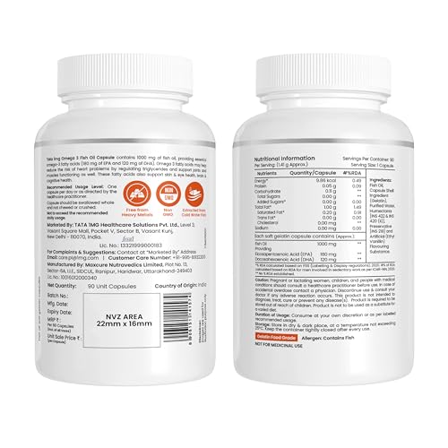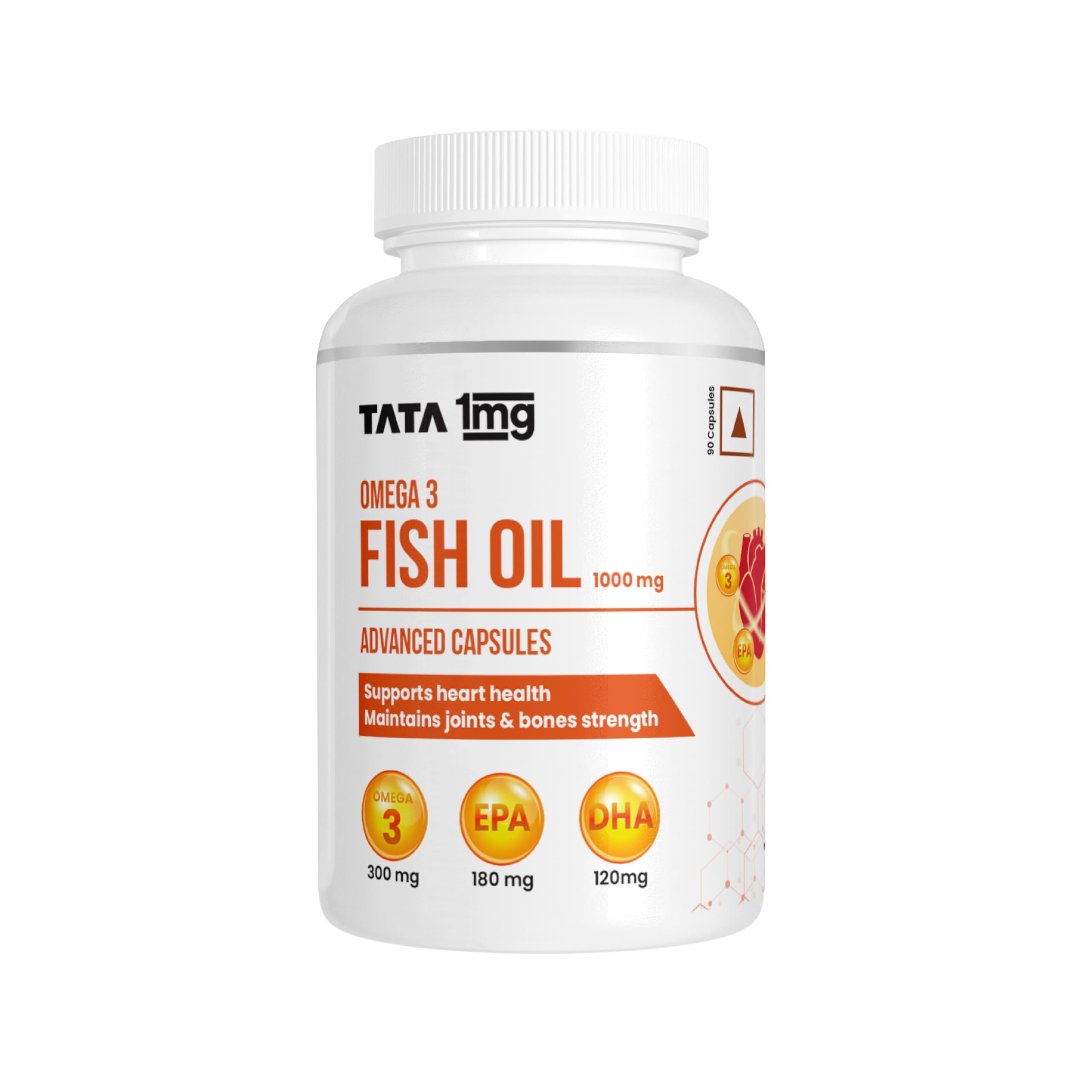 Tata 1mg Omega 3 Fish Oil Capsule contains 1000 mg of fish oil which provides essential omega-3 fatty acids (180 mg of EPA and 120 mg of DHA). Omega 3 fatty acids may help reduce the risk of heart problems by regulating triglycerides and supporting joint and muscle functioning as well. Fish oil for cholesterol ensures they remain in check and helps maintain optimal cardiac functions. These fatty acids also support skin and eye health and brain and cognitive health.