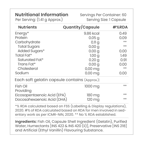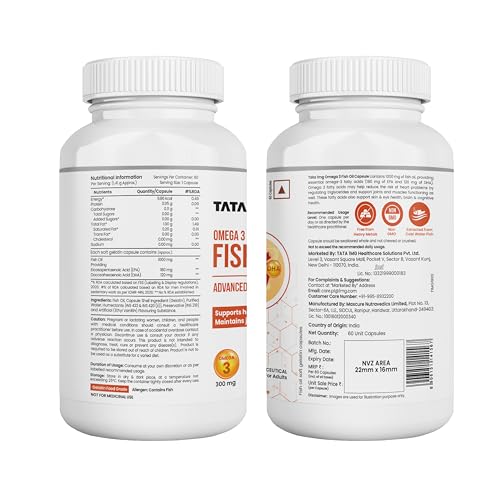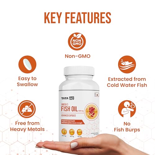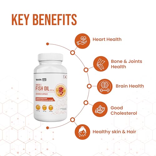 Tata 1mg Omega 3 Fish Oil Capsule contains 1000 mg of fish oil which provides essential omega-3 fatty acids (180 mg of EPA and 120 mg of DHA). Omega 3 fatty acids may help reduce the risk of heart problems by regulating triglycerides and supporting joint and muscle functioning as well. Fish oil for cholesterol ensures they remain in check and helps maintain optimal cardiac functions. These fatty acids also support skin and eye health and brain and cognitive health.