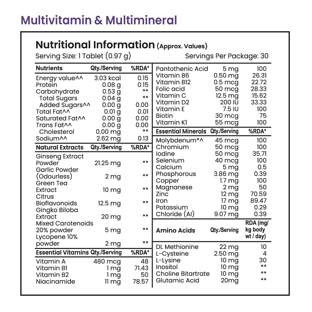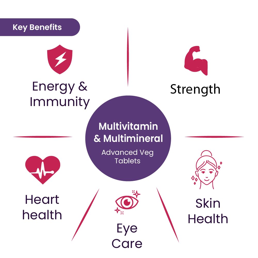 Tata 1mg Multivitamin and Multimineral Advanced Veg Tablets is your complete daily health veg supplement. It is packed with 13 essential vitamins and 12 key minerals 6 amino acids and 7 natural health extracts. It helps support immunity provide energy maintain cardiovascular health and improve fitness and strength. It helps prevent free radical damage and enhances memory and concentration and supports overall well-being.
