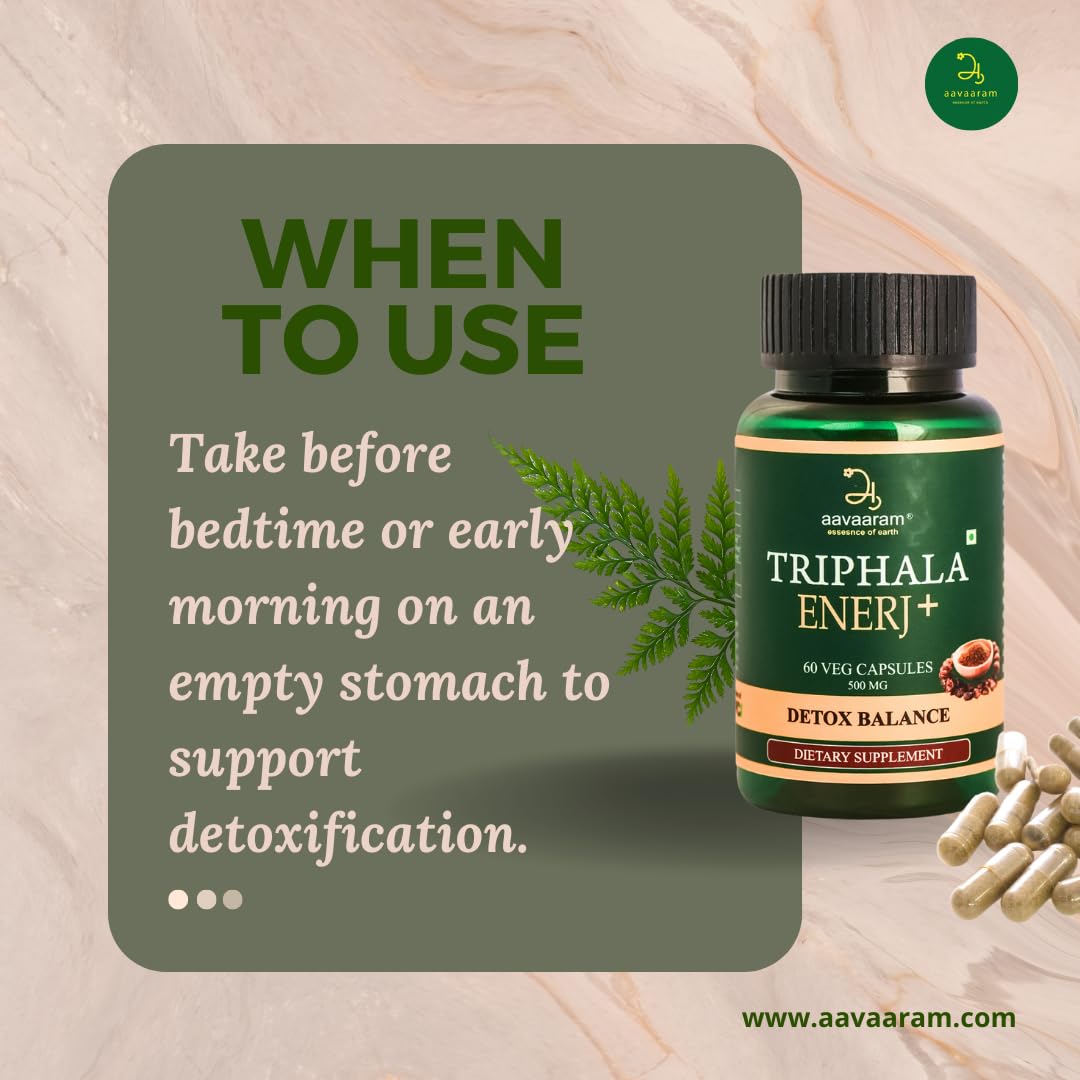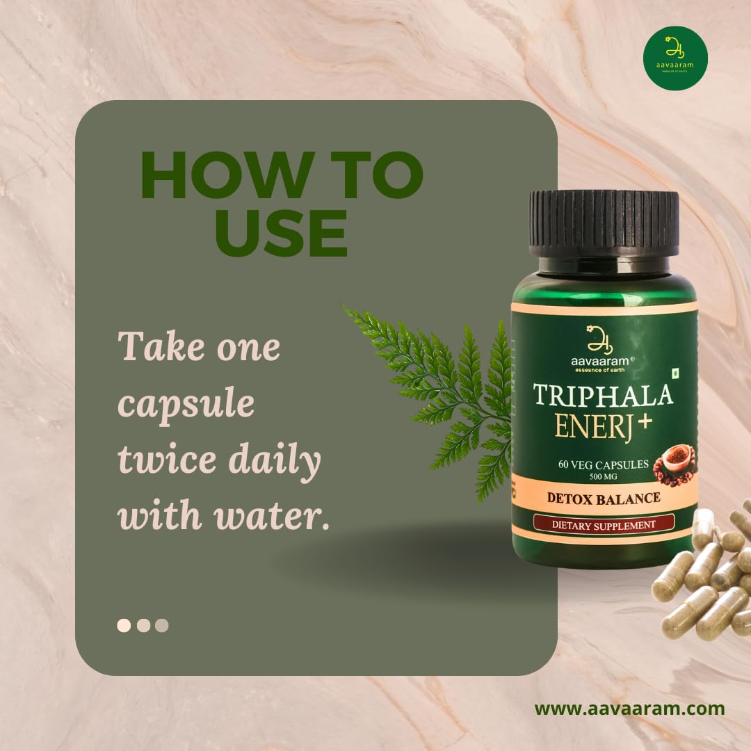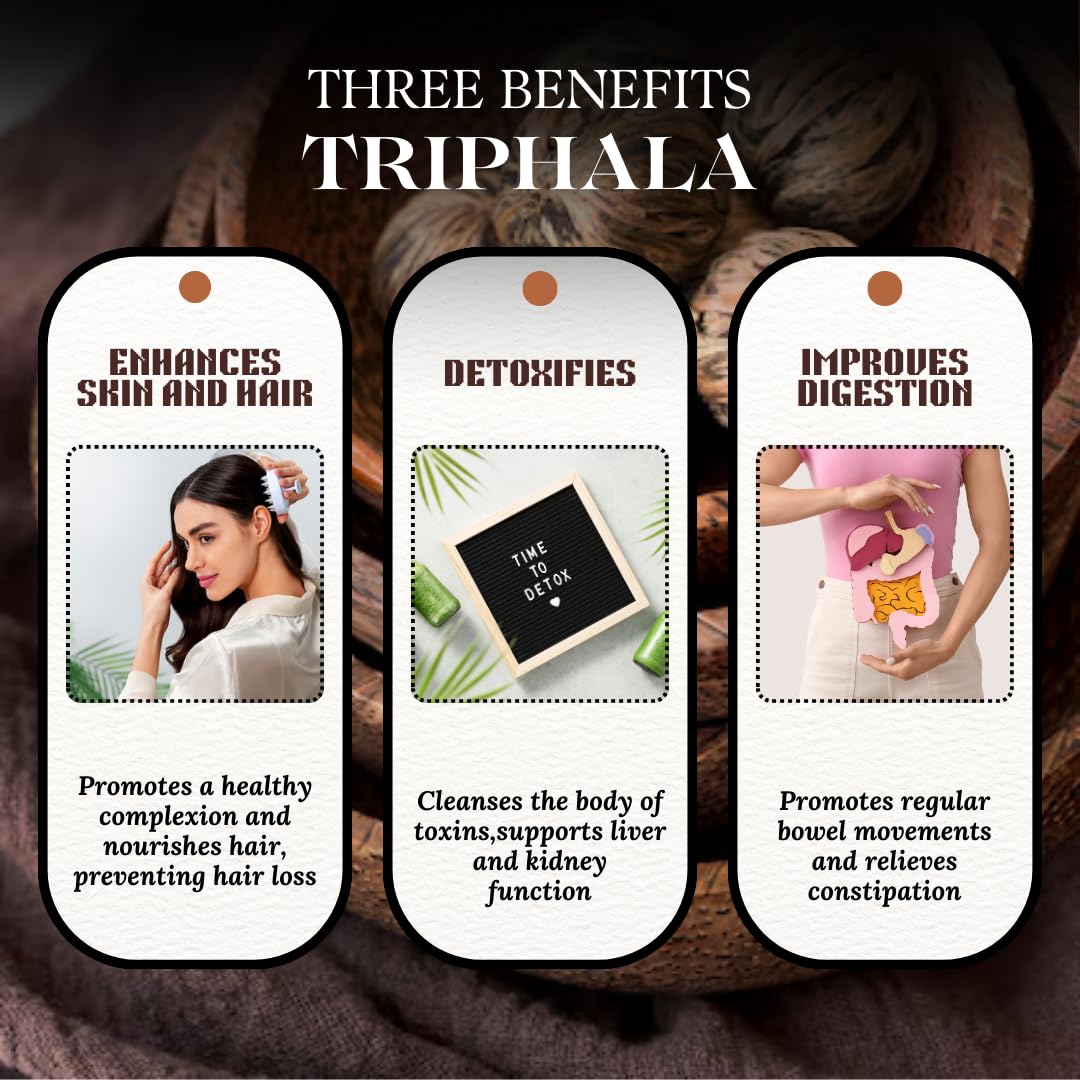 Triphala Capsules â Your Gateway to Holistic Wellness Embrace the ancient wisdom of Ayurveda with our premium Triphala capsules. Crafted from a blend of three powerful fruitsâAmalaki (Indian Gooseberry) Bibhitaki and Haritakiâthese capsules are your daily dose of natural vitality. Supports digestion detoxification and gut health. Rich in antioxidants to promote immunity and vitality. 100% pure natural and free from artificial additives. Vegetarian-friendly and easy to incorporate into your routine. Usage: Take 1-2 capsules daily with water or as recommended by a healthcare professional. Rejuvenate your body and mind with the holistic power of Triphala Capsules!