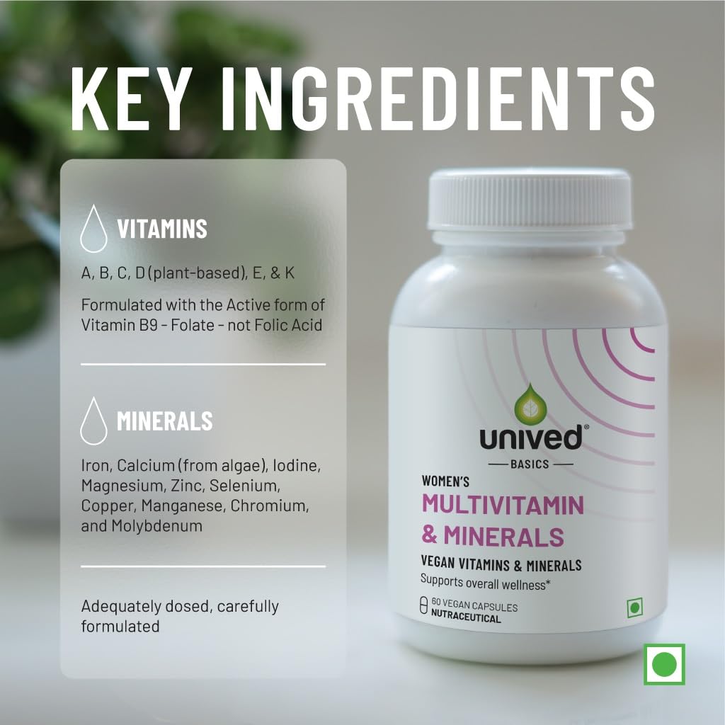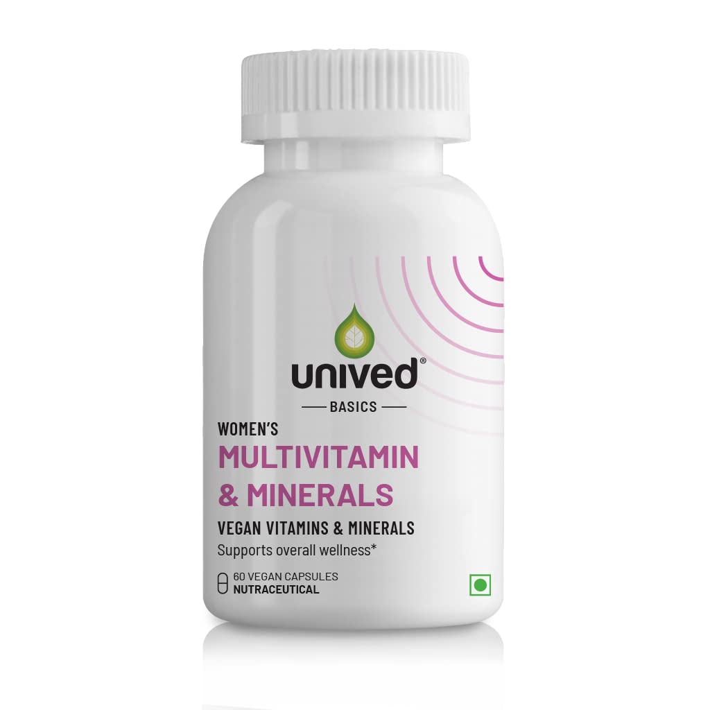 HomeHealth & PersonalDiet & NutritionHealth SupplementsUnived Basics Multivitamin & Minerals For Women 100% Rda Of All Vitamins With Algae Calcium & Plant-Based Vitamin D3 Plus Important Minerals Complete Formulation For Health & Wellbeing - Capsule
