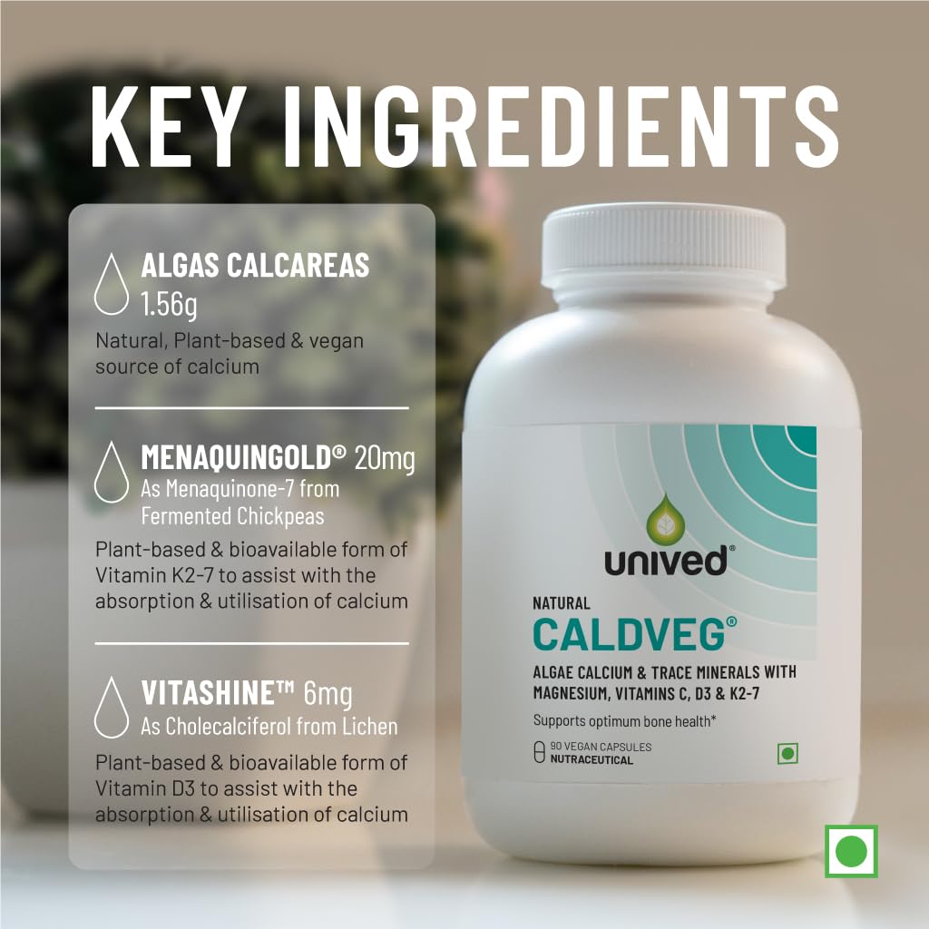 CalDveg is a 100% natural high absorption formula to keep bones strong and healthy; It's formulated with 500mg Algae calcium 82mg Algae Magnesium 80mg plant-based Vitamin C 600 I.U. plant-based Vitamin D3 & 50mcg natural Vitamin K2-7 for optimum bone health and healthy bone ageing; Essential for individuals suffering from osteoporosis and low bone density Suitable for vegetarians;