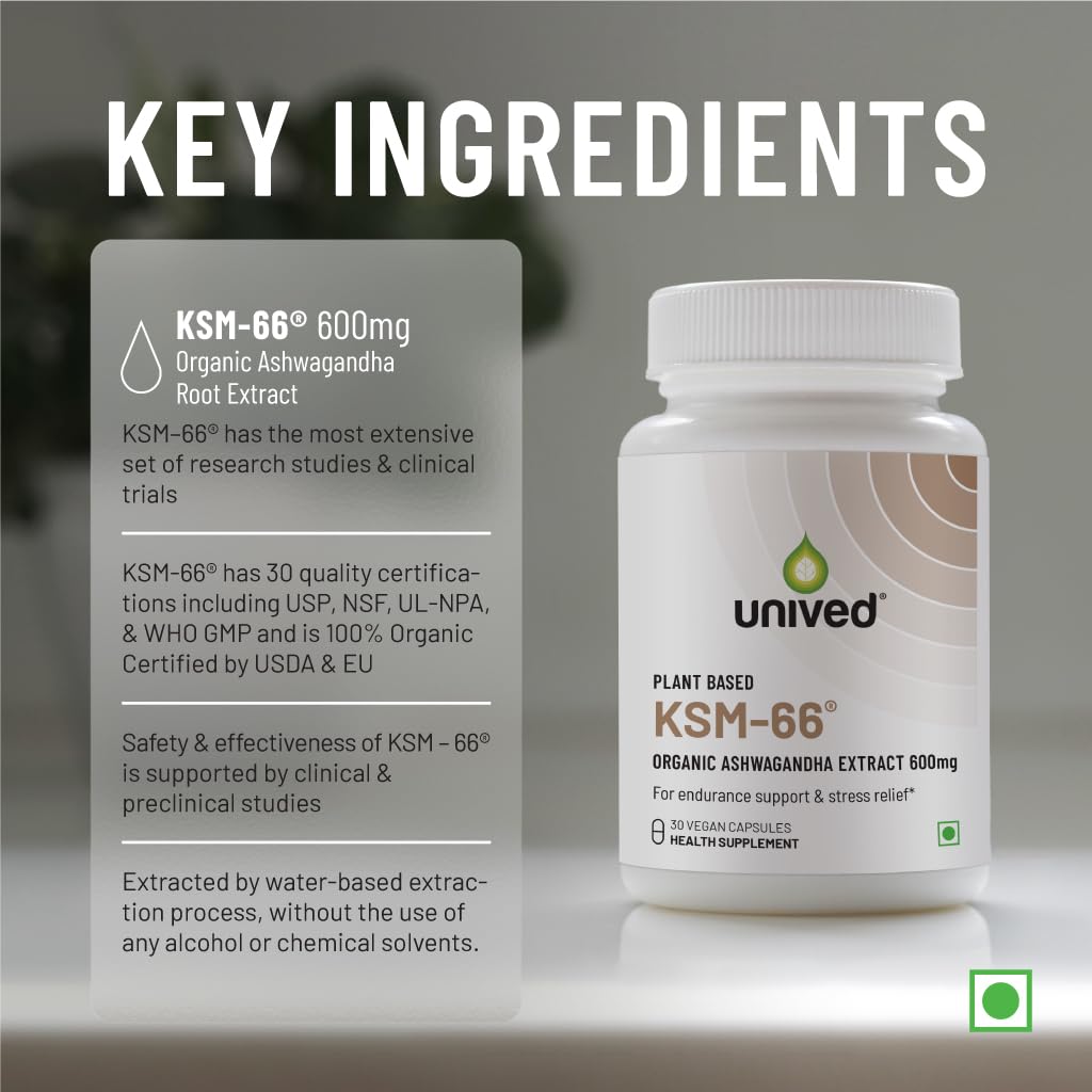 UNIVED VEGAN KSM-66: KSM-66 Ashwagandha is a root-only extract standardized to 5% withanolides by HPLC which is the highest pure withanolid concentration available. Our Vegan KSM-66 Ashwagandha skips the milk pre-treatment and is a special Vegan version.