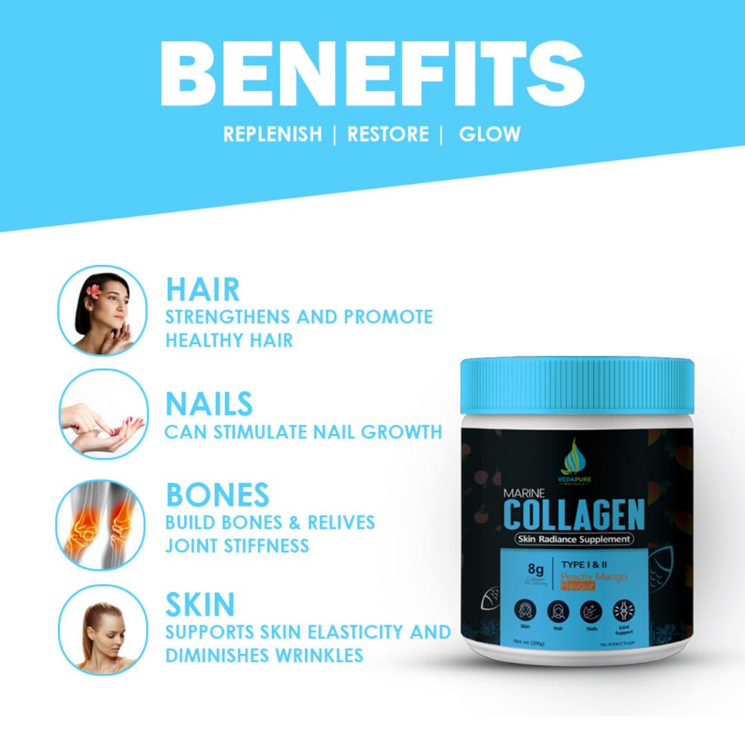 Vedapure Naturals Marine Collagen Powder & Omega 3 Fish Oil Capsule Combo is a complete health supplement designed for both men and women. It supports heart brain joint muscle and skin health with the combined power of marine collagen and Omega-3 fatty acids. Ideal for daily use it promotes overall wellness youthful skin and active living.