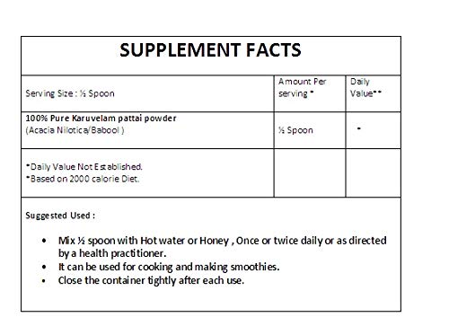 The Karuvelam pattai powder or the raw Babool powder made by Way4Organic is wrapped in such a way that it’s authenticity is secured in order to experience all of it’s natural benefits. Oral hygiene and every single dental issue can be aided comprehensively with the help of the Karuvelam pattai powder. This is one of the easily available trees in the Indian native and is intended to be used for its natural health benefits where all of the parts of the tree is full of curative values. Fully organic Karuvelam pattai powder from Way4Organic is entirely safe and guards the body from potential harm caused by viruses and fungi. These properties make it strikingly commendable especially for the maintenance of the oral health and hygiene. This powder is found to be a restorative supplement for the skin and hair and assist in preventing excessive hair fall. The major purpose of the Karuvelam pattai powder is to help in protecting the teeth and gums from various possible oral botherations. Features