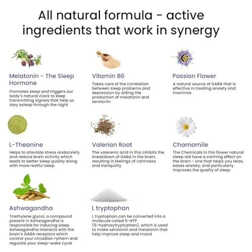 • FAST-ACTING INGREDIENTS FOR UNINTERRUPTED SLEEP: L-Theanine reduces brain activity lowers mental stress and ensures deep sleep. L- tryptophan can be converted into a molecule called 5-HTP (5-hydroxytryptophan) which is used to make serotonin and melatonin