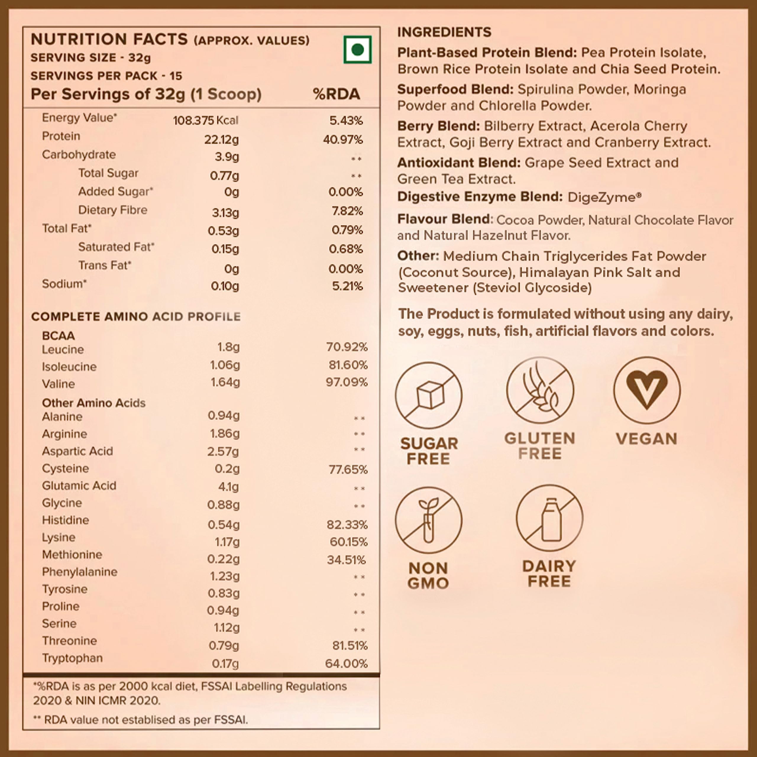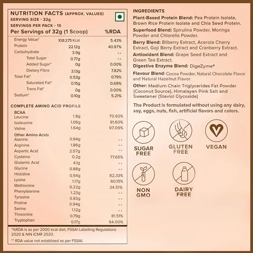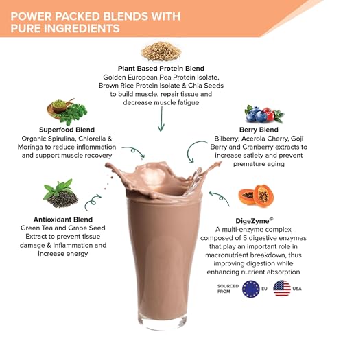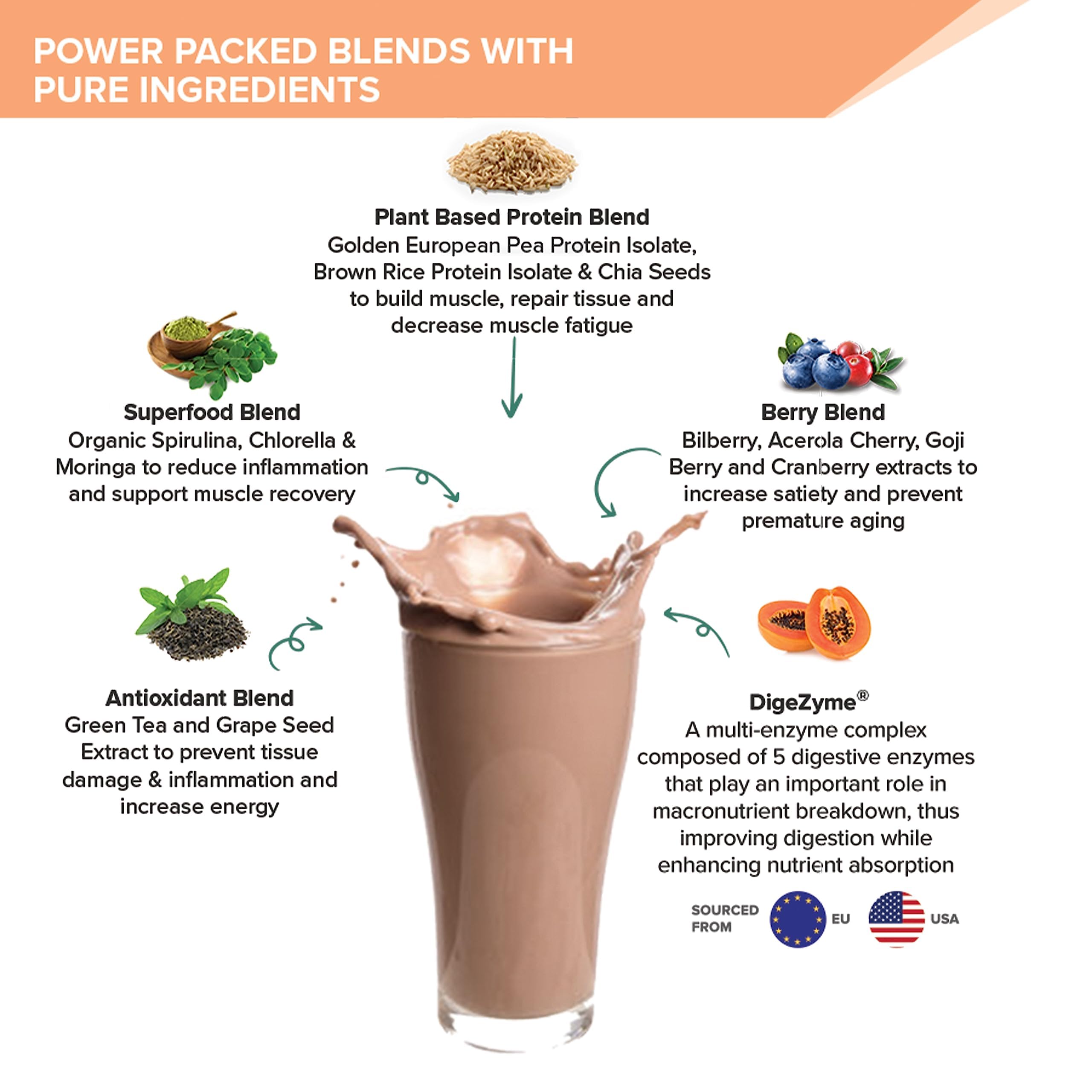 • SUPERIOR PROTEIN FOR MUSCLE GROWTH & REPAIR : With 22 grams of pure protein sourced from European Pea Protein Isolate Brown Rice Protein Isolate and Chia Seeds this plant protein is an excellent post workout companion with a complete amino acid profile th
