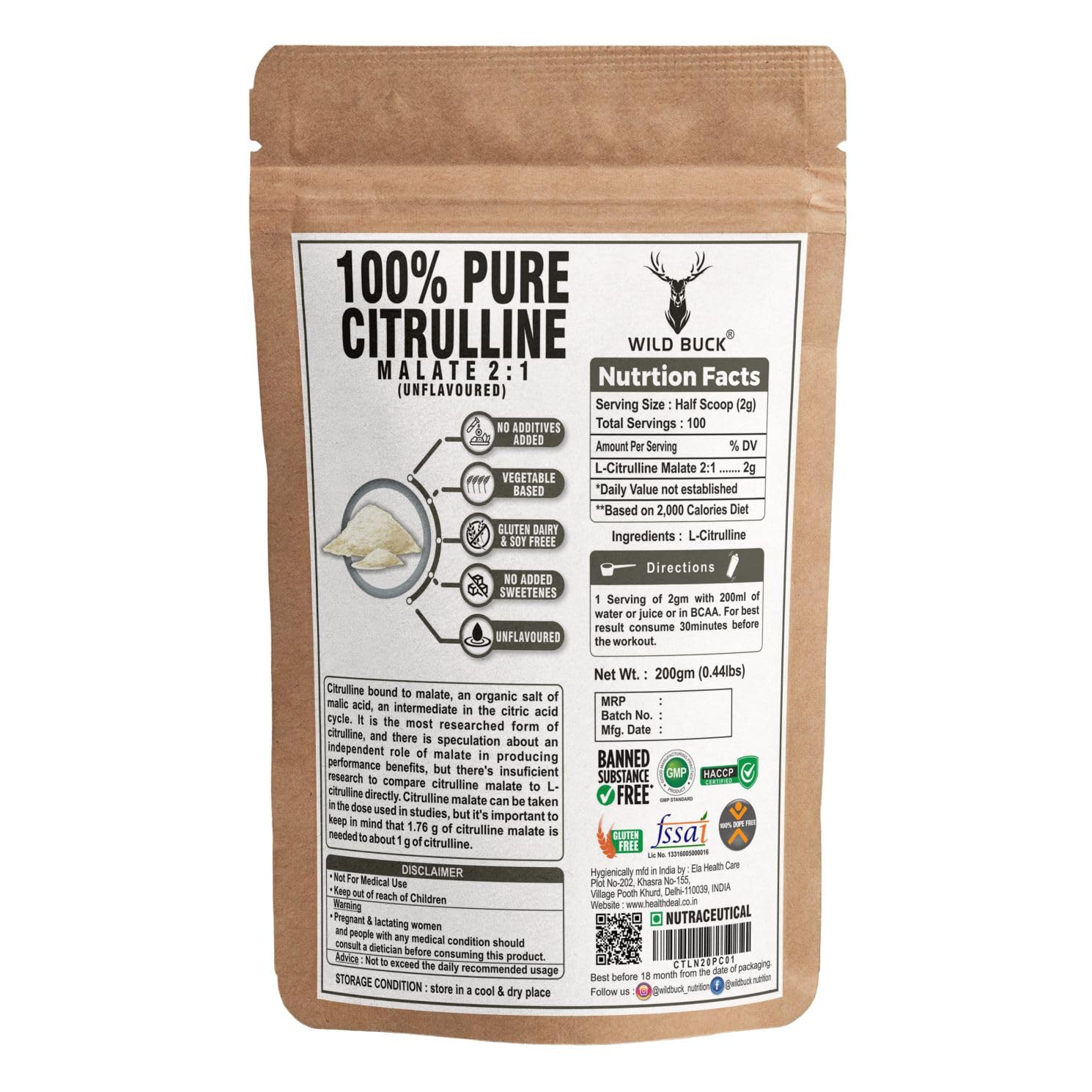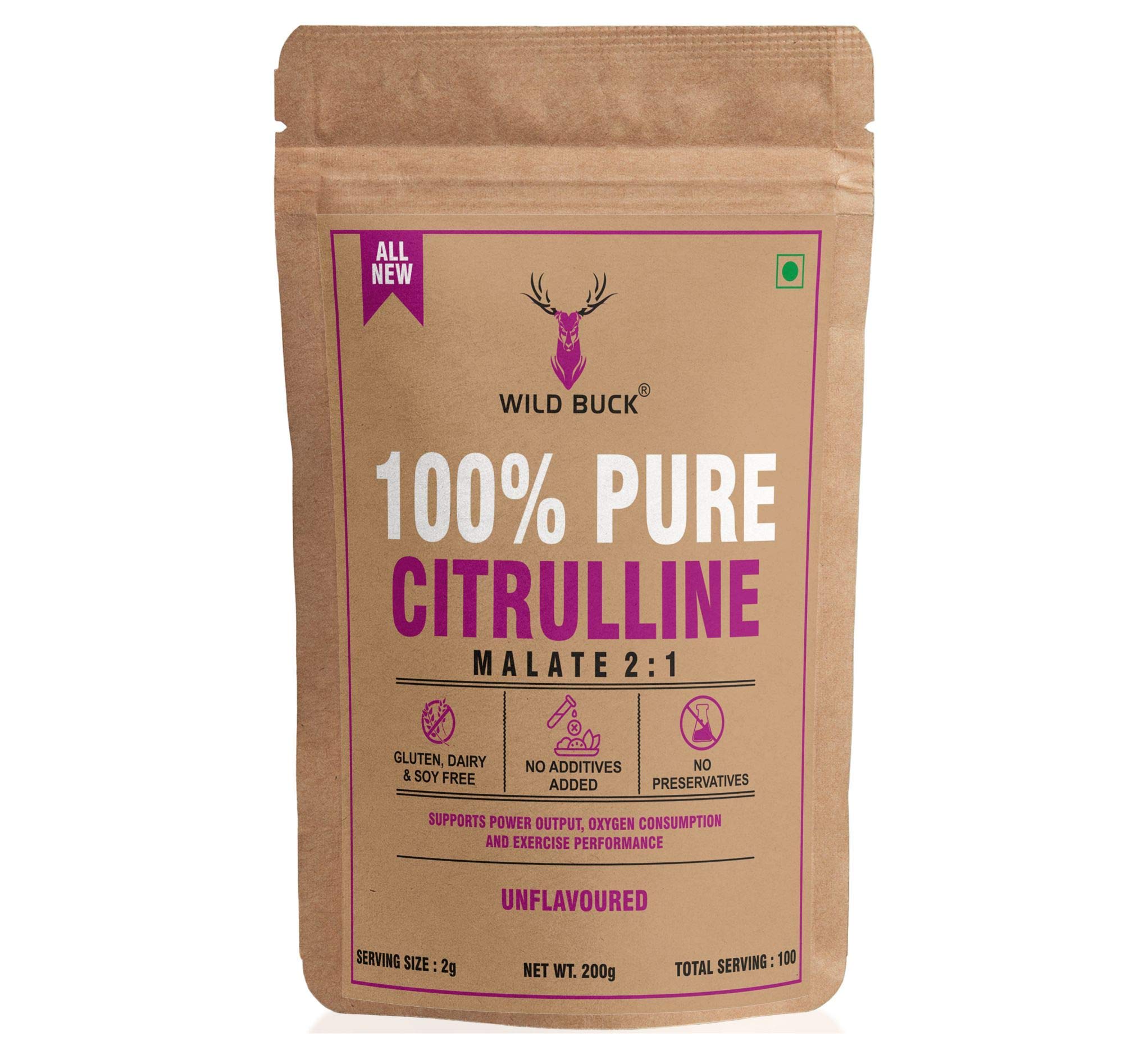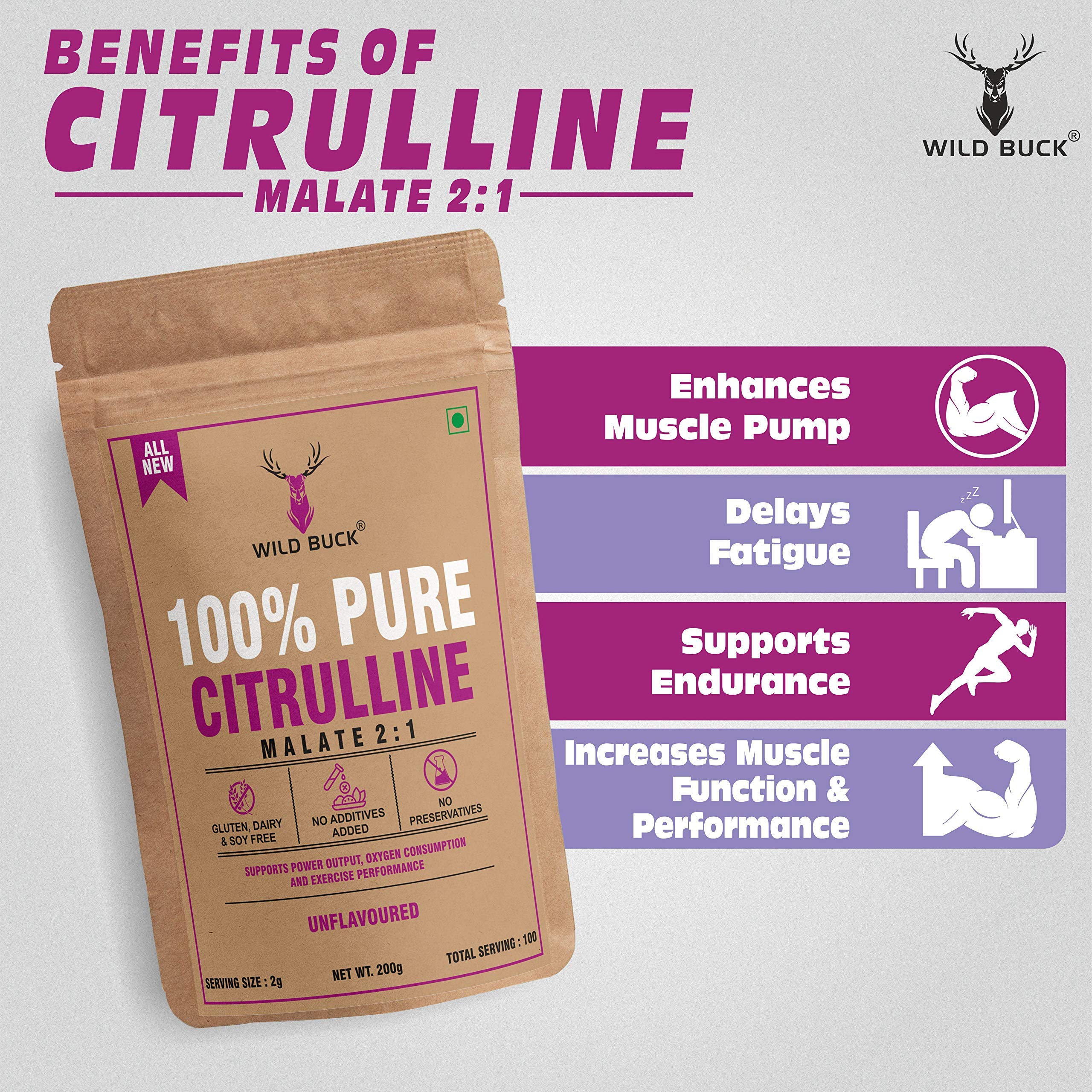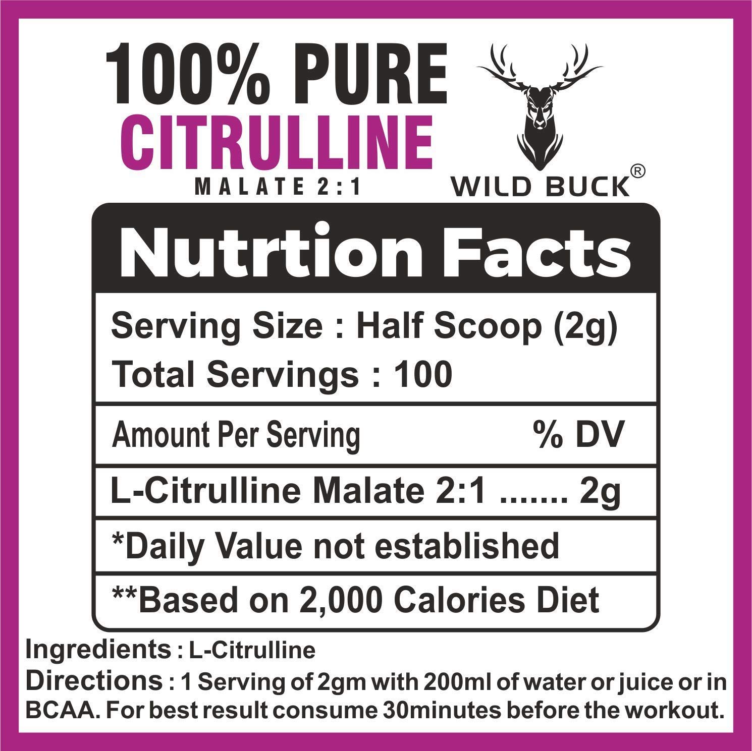 No pre-workout supplement stack is complete without Citrulline. It is every bodybuilderâs dream to have a perfectly chiseled physique with impressive pumps. Citrulline Malate helps bodybuilders fulfill their dream of having those perfect pumps. Citrulline Malate helps in increasing the concentration of arginine and eventually boosting the levels of Nitric Oxide. Nitric Oxide functions as a vasodilator which enhances the diameter of blood vessels boosting blood flow to the muscles that are involved in the workout. This helps in boosting the pump. It boosts the endurance and capacity of the workout by supplying more oxygen to the muscles. Citrulline Malate is a non-essential amino acid that helps in boosting the pump and enhancing your exercise performance. It also helps in building muscle endurance. To nourish your body with this amazing nutrient Wild Buck has formulated Wild Buck Citrulline Malate that offers you 2g of this special nutrient to enhance your pump.